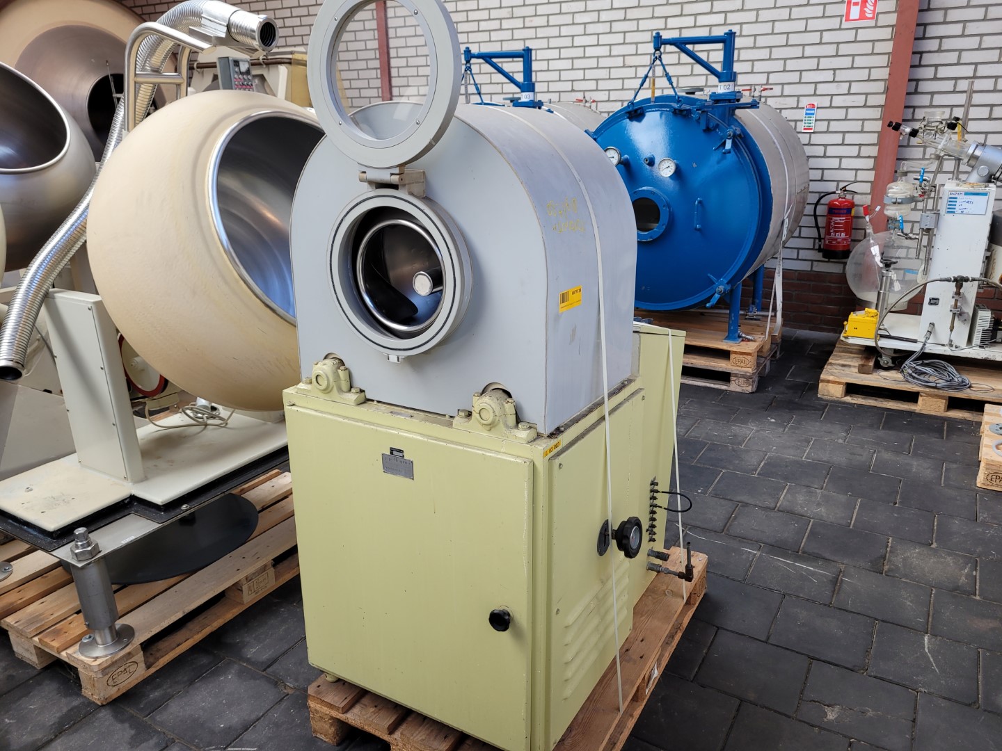General SKU049Z263 HerstellerLödige Paderborn TypLHC-130 Hi-Coater №12919 Baujahr1992 StandortBarneveld Haupteigenschaften MaterialEdelstahl Motor20 KW Einlass durchm.1300 mm Spezifizierte Eigenschaften - Dragierkessel MaterialEdelstahl 1.4401 (316) Dragieranlagecheck Film and sugar coating unit Chargengroessemax. 150 kg Kesseldurchmesser1300 mm Zylindrische Breite350 mm Motor± 3,0 kW, 415 Volt (Ex) Mit Frequenzumrichtercheck Mit Dampfheizungcheck air supply unit, type NHK-HYD Mit Gebläsetype KXE-160 Leistung1800 m3/hr Motor20,0 kW, 415 Volt (Ex) Mit Sprührarmcheck Information Mit Schaltschrank2,8 x 0,5 x 2,1 m Platzbedarf2,2 x 1,8 m Totalhöhe2,3 m Gewicht ...