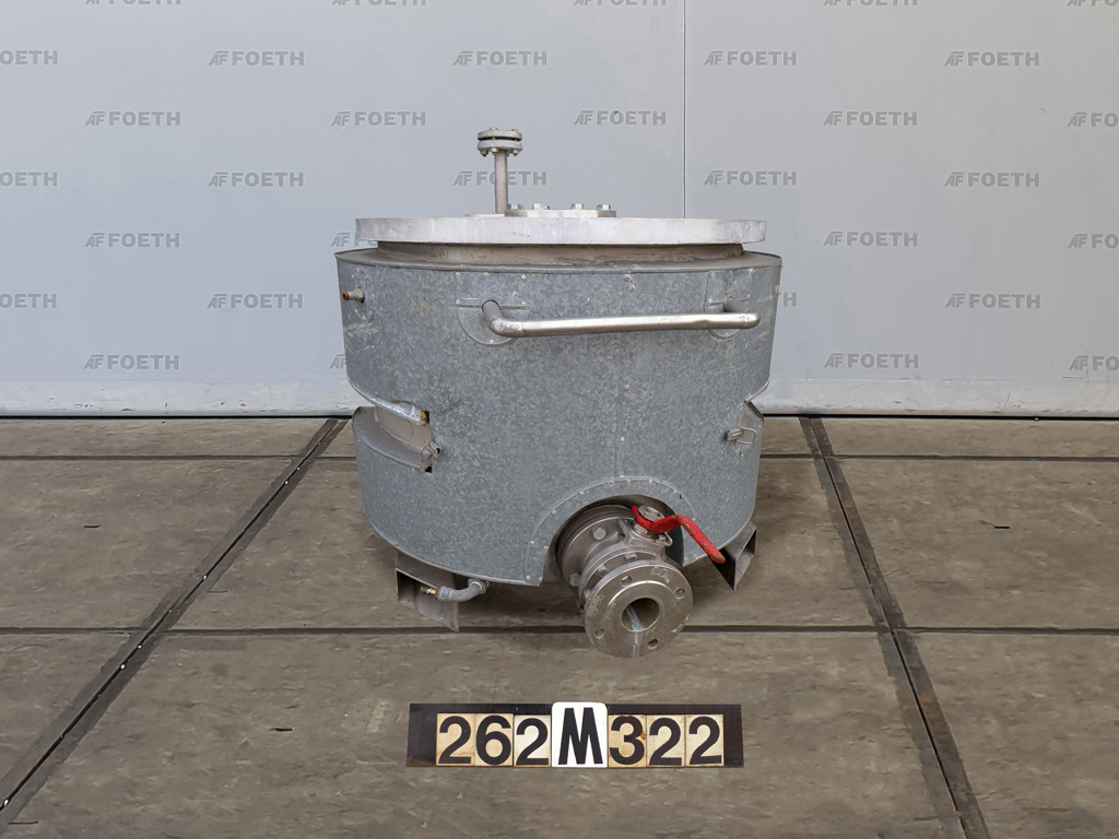 General SKU262M322 Herstellerunknown, manufacturer plate is missing Gebaut auf Füsse(verrijdbaar) Haupteigenschaften MaterialEdelstahl Inhalt300 Ltr. Spezifizierte Eigenschaften - Vertikale Behälter MaterialEdelstahl Offene vertikale Behälter(1x) Inhalt300 Ltr. Kesselabmessungendia. 785x610mm Mit Deckelcheck Flache Bodencheck Obenanschlüssedia. 30mm Auslaufdia. 70mm Mit Doppelmantelcheck Information StandortBarneveld Platzbedarf1,1x1,1 M Totalhöhe0,9 M Gewicht350 KG Was Sie von Maschinen von Foeth erwarten können: -- Maschine funktioniert fähig -- Zu einem reduzierten Preis im Vergleich zu Neuem -- Bereit, überall auf der Welt zu versenden -- Gerne können S ...