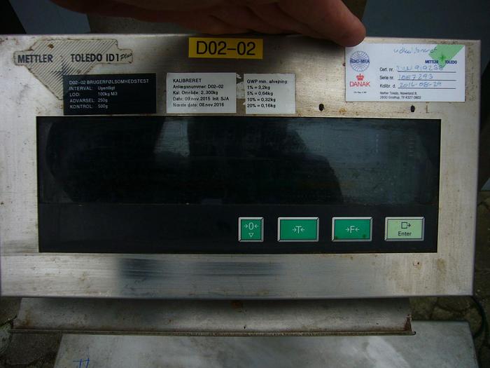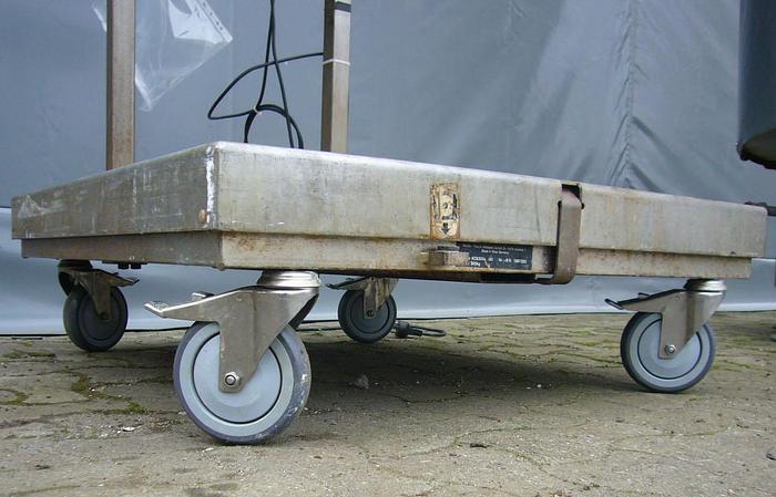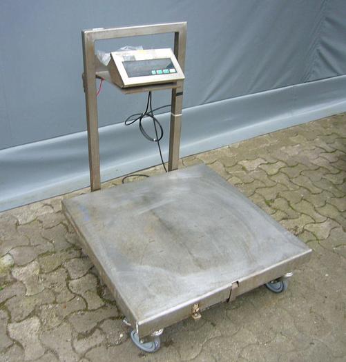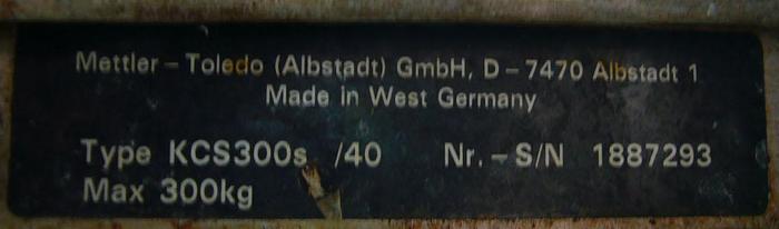 Best.-Nr.: F938, Digitalwaage, Edelstahl., Mettler Toledo, KCS300S., Wägebereich 2-300 kg., Intervall 20 g., Wanddisplay mit Tara-Funktion., Edelstahl-Wägeplatte:, L 800 x B 800 x H 250 mm., Stehend auf Rädern., Material: Edelstahl AISI 304, Wiegebereich: 2-300 kg., Intervall: 20 g.