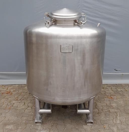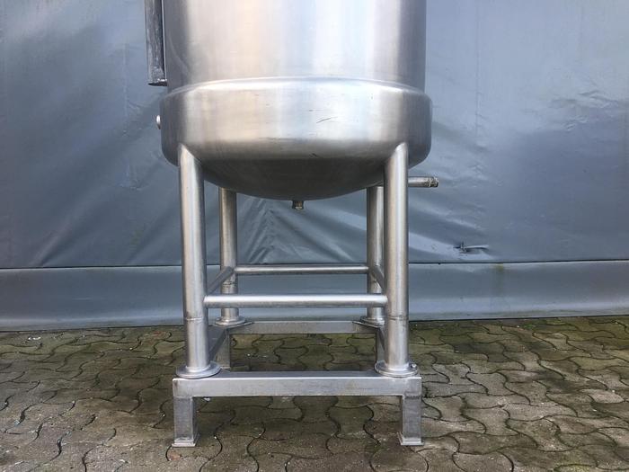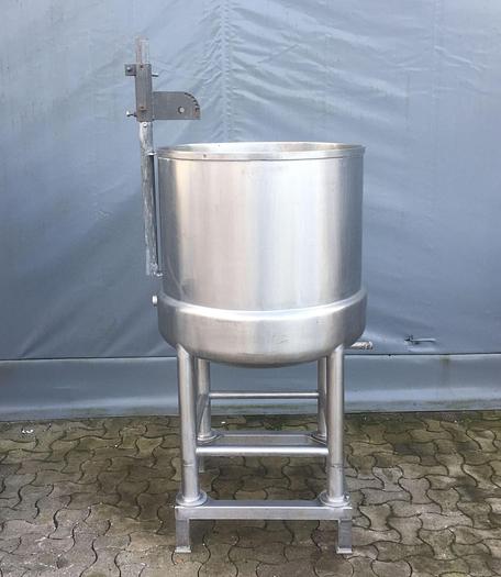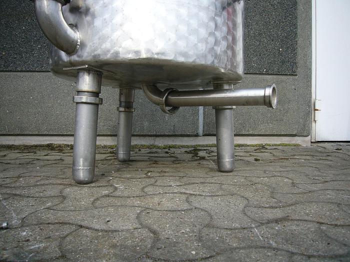 300 Liter, Best.-Nr.: T3677, Liter: 300, Material: Edelstahl AISI 316, Auf Lager: Ja, Menge auf Lager: 1 Stk., Artikel: Tank, Stehend: Auf Gestell mit 4 Stk. Anzahl der Beine, Oberseite: Offen mit Verstärkungsring, Unterseite: Verteilt, Doppelmantel: Ja, Innendurchmesser: 750 mm., Außendurchmesser: T 810 mm., Maße: L 630 x B 630 x H 1850 mm.