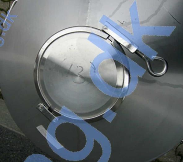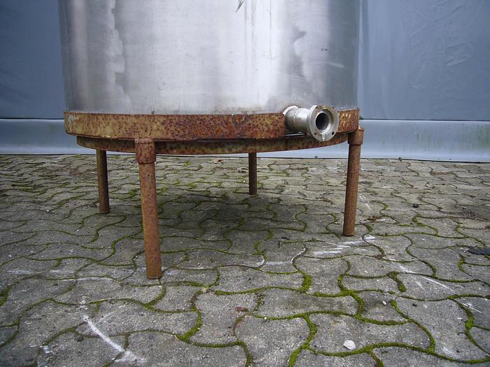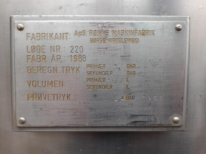 1.600 Liter, Best.-Nr.: T3934, Liter: 1.600, Material: Edelstahl AISI 316, Auf Lager: Ja, Menge auf Lager: 1 Stk., Artikel: Tank, Stehend: 4 Stk. Beine mit LKW-Griff, Oben: Unten: Unten: Verzinkt, Doppelmantel: Nein, Isoliert: Nein, Tankabdeckung: Oben 400 mm., Rührwerk: Ja, Rührwerkstyp: Magnet, Arbeitsdruckbehälter: 1,8 bar, Innendurchmesser: 1350 mm., Gesamthöhe: 1650 mm., Hersteller: Rønne Maskinfabrik, Baujahr: 1988