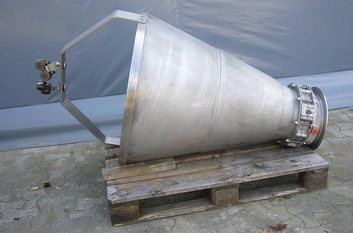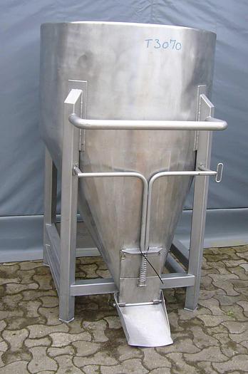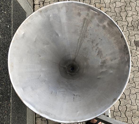 285 Liter, Best.-Nr.: T3450, Trichter, rostfreier säurebeständiger Stahl,, oben offen, mit Verstärkungsring oben., 4 Beinkonsolen,, 870 mm., Der Trichter ist angestoßen., Liter: 285, Material: Edelstahl AISI 316