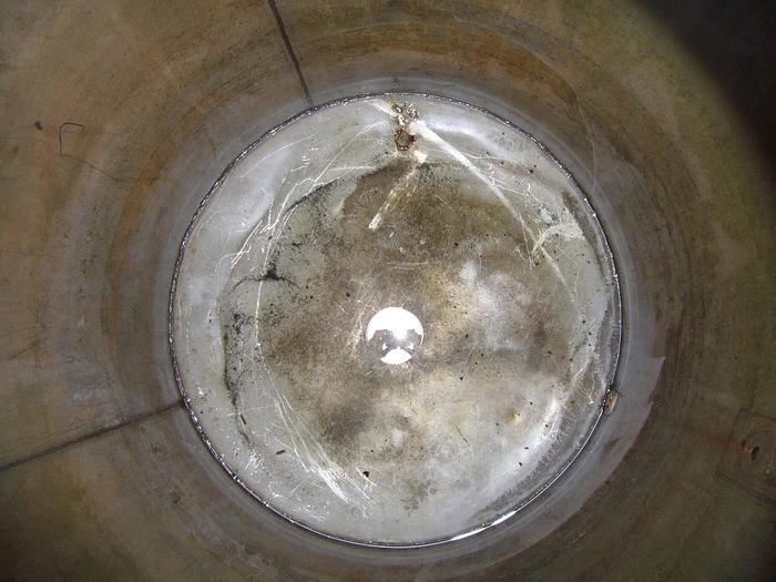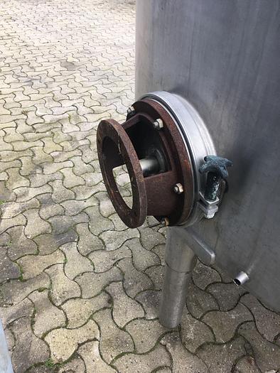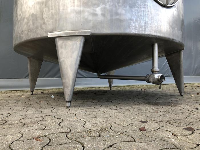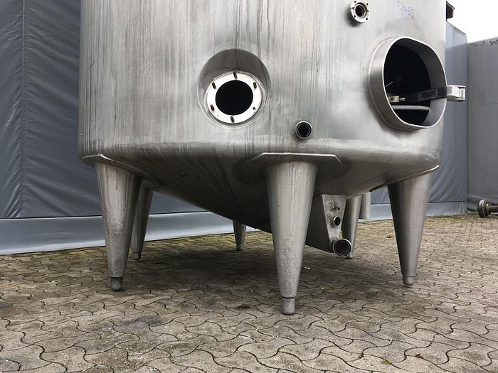10.000 Liter, Best.-Nr.: T3686, Tank, Edelstahl,, oben geschlossen, auf Füßen stehend., Oben und unten konisch, Waschflügel oben., Tankdeckel an der Seite,, Flansch für Rührwerk an der Seite., 2000 mm., Der Tank ist oben leicht verbeult., Liter: 10.000, Material: Edelstahl AISI 304