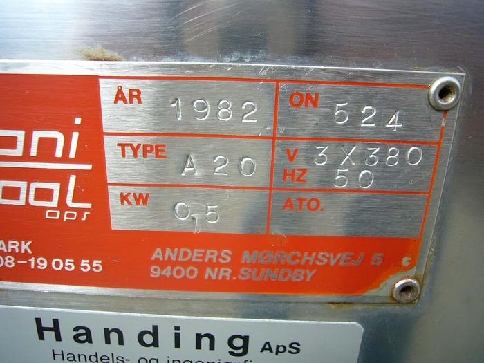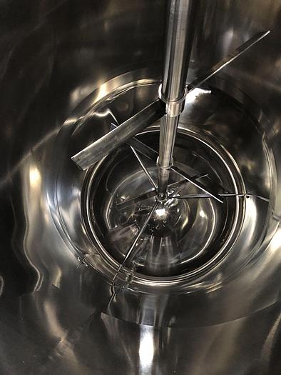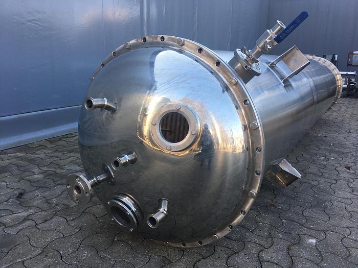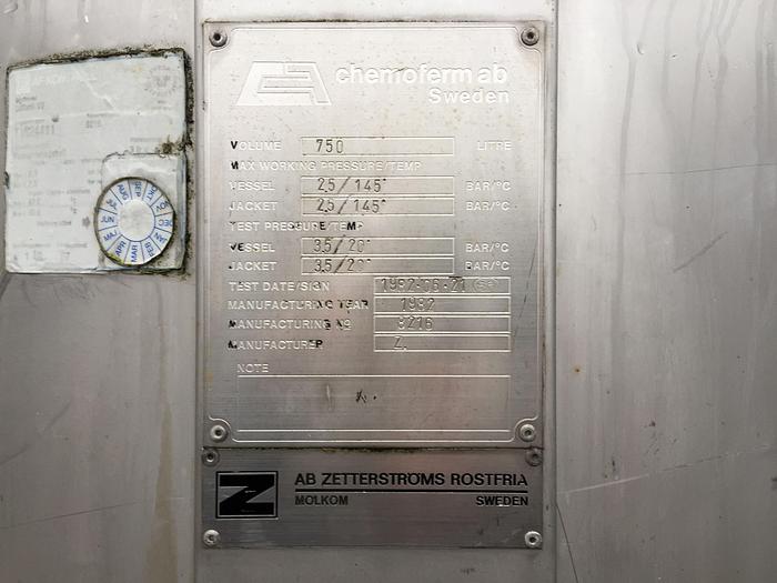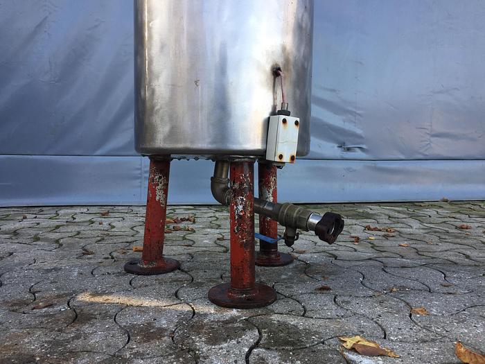 750 Liter, Best.-Nr.: T2423, Liter: 750, Material: Edelstahl AISI 316, Auf Lager: Ja, Menge auf Lager: 1 Stk., Artikel: Tank, Stehend: 3 Stk. Füße, Oben: Unten: Verzinkt, Doppelmantel: Ja, Tankdeckel: Oben, 450 mm., Rührwerk: Ja, Rührwerktyp: 2- und 3-Blatt-Propeller, Motor: 0,55 kW - 220/380 Volt - 98 U/min., Arbeitstemperatur: 20-145 C, Arbeitsdruckbehälter: 2,5-3,5 bar, Arbeitsdruck Doppelmantel: 2,5-3,5 bar, Innendurchmesser: 770 mm., Außendurchmesser: T 810 mm., Gesamthöhe: 2340 mm., Hersteller: chemoferm ab, Baujahr: 1982