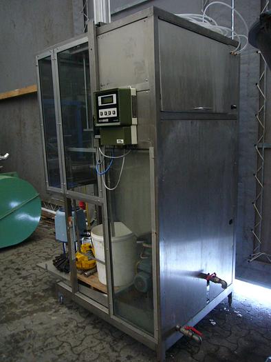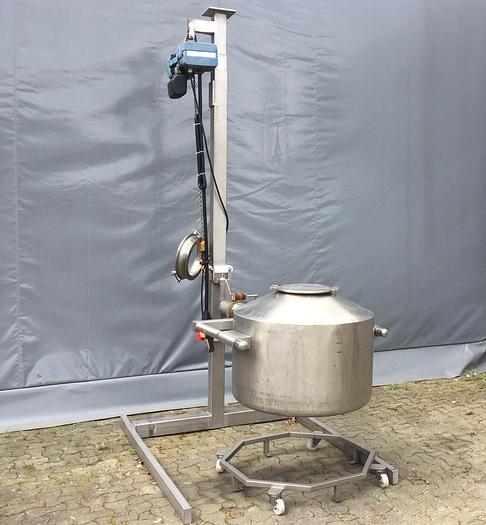 275 Liter, Best.-Nr.: T2410, Liter: 275, Material: Edelstahl AISI 304, Auf Lager: Ja, Menge auf Lager: 1 Stk., Artikel: Tank, Stehend: Auf Säule, Oben: Unten, Innendurchmesser: 800 mm., Maße: L 1800 x H 3000 mm., Sonstiges: Säule mit elektrischem Hebezeug, kippbarer Funktion und loser Radablage