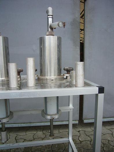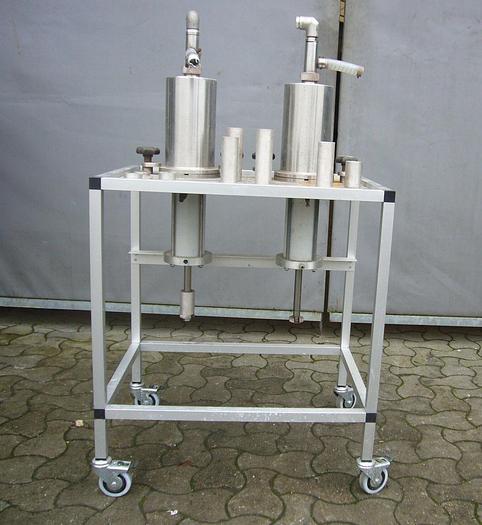 Best.-Nr.: F764, Abfüllmaschine, Edelstahl,, Doppeltyp LS, einhängend, Aluminiumrahmen., Variable Dosierung, max 2 x 1,5 l., Luftbetrieben., Material: Edelstahl AISI 304