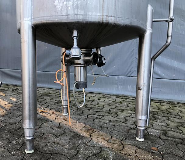 6.000 Liter, Best.-Nr.: T3639, Tank, Edelstahl,, oben geschlossen, auf Beinkonsole stehend., Doppelmantel., Isolierte, äußere vollverschweißte Edelstahlverkleidung., Konischer Boden,, Gewölbte Oberseite., Tankdeckel oben,, Waschkugel oben., Rührwerk von oben mit unterer Führungsbahn,, 1600 mm., Liter: 6.000, Material: Edelstahl AISI 304