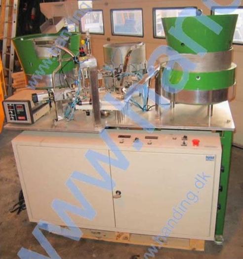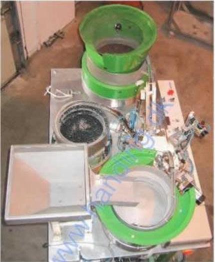 Best.-Nr.: F624, Füll-/Verschließmaschine, Edelstahl,, für Reagenzgläser., LSM Typ PPU 10,, Rundtisch mit:, a) Sortierung von Reagenzgläsern., b) Sortierung und Montage von O-Ringen., c) Füllung., d) Sortierung und Montage von Kapseln., e) verfügbar., f) Ausgang., Material: Edelstahl AISI 304