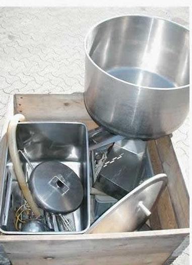 150 Liter, Best.-Nr.: T2299, Liter: 150, Material: Edelstahl AISI 304, Auf Lager: Ja, Menge auf Lager: 1 Stk., Artikel: Käsekessel, Stehend: Im Gestell mit Kippe, Doppelmantel: Ja, Rührwerk: Ja, Maße: Wanne: L 550 x B 900 x T 430 mm., Außenmaße: L 1250 x B 1300 x H 1360 mm., Hersteller: Paasch Silkeborg, Sonstiges: Warmwasserbereiter mit variabler Drehzahl und 35 l. Flussmittelbehälter