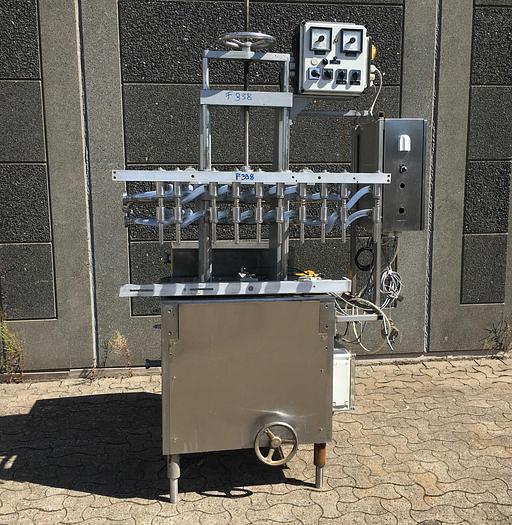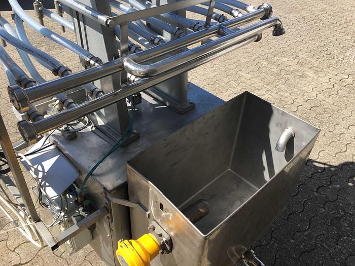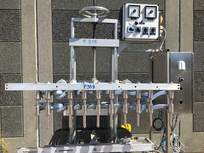 Best.-Nr.: F338, Abfüllmaschine, Edelstahl, Typ ADA., 10 Füllstutzen., Gleitschiene, Auslaufband und, Ausgleichsbehälter., Abschirmung., Material: Edelstahl AISI 304