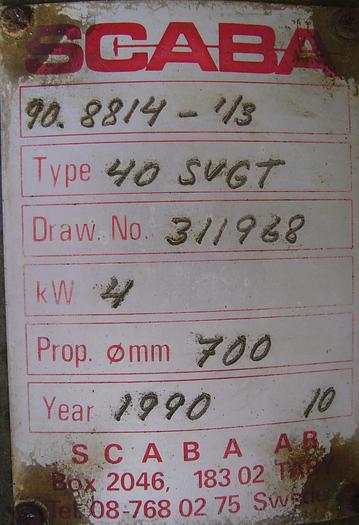 Best.-Nr.: R995, Rührwerk, Edelstahl, Scaba Typ 40 SVGT., für seitliche Montage am Tank (T3163), 4 kW Getriebemotor, 176 U/min., 220/380V., D 700 mm. 3-Blatt-Propeller., Material: Edelstahl AISI 304, Propellergröße: D 700 mm.