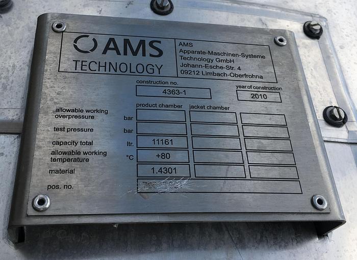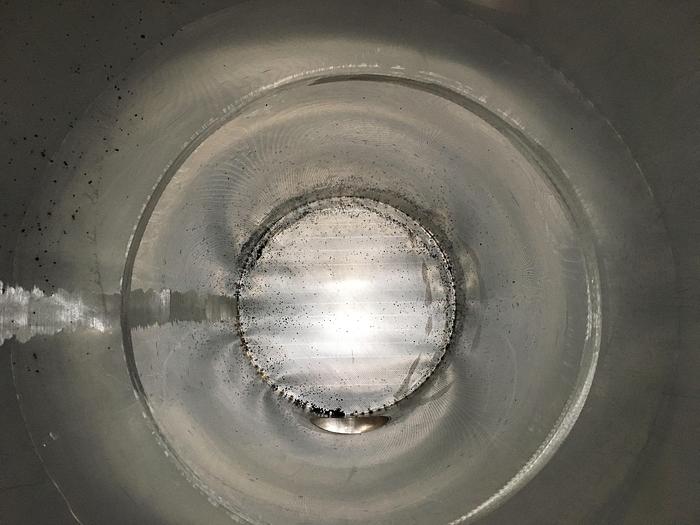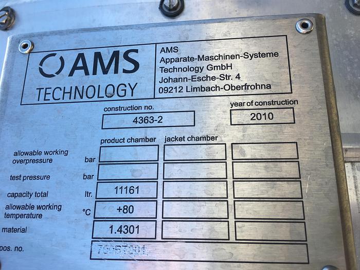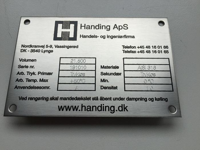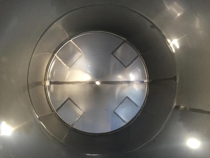 21.500 Liter, Best.-Nr.: T3621, Tank, rostfreier säurebeständiger Stahl, geschlossen, auf 4 Füßen stehend, oben konisch 15., konisch unten 20., Tankdeckel oben 500 mm., 3 Stk. Verbindungsstücke, Alle Schweißnähte auf der Innenseite sind geschliffen Korn 60., Alle Schweißnähte auf der Außenseite sind sandgestrahlt, Tankabmessung 2500 mm x Ummantelung 4180 mm., Der Tank ist aus gebeiztem Blech Typ B2 gefertigt., Dichte: 1,0., Arbeitstemperatur: 0-+50C., Arbeitsdruck: drucklos., Anwendungsbereich: A, Liter: 21.500, Material: Edelstahl AISI 316