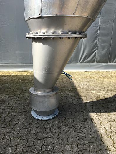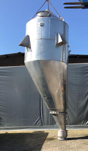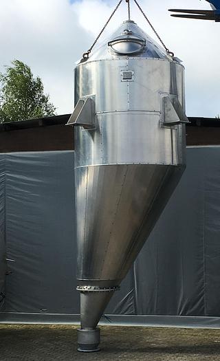 5.000 Liter, Best.-Nr.: T2225, Silo, Edelstahl, für Pulver/Granulat., Hängende Montage., Konische Oberseite., Tankdeckel oben., Konischer Boden., Vibrationsauslass unten., 1900 mm., Liter: 5.000, Material: Edelstahl AISI 304