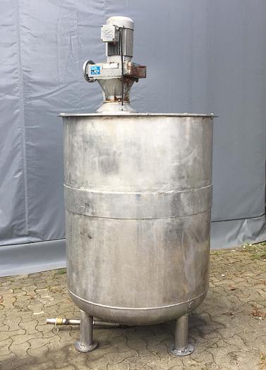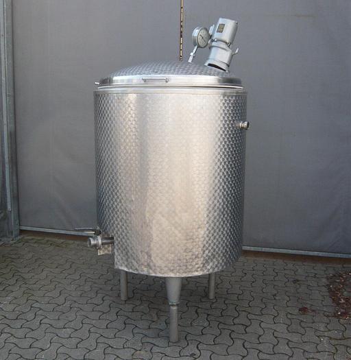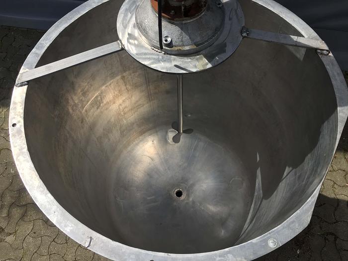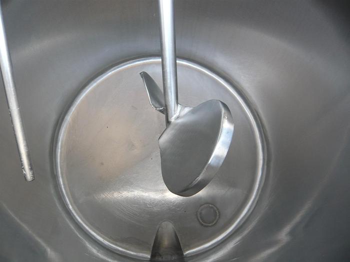 500 Liter, Best.-Nr.: T2282, Liter: 500, Material: Edelstahl AISI 304, Auf Lager: Ja, Menge auf Lager: 1 Stk., Artikel: Tank, Stehend: 3 Stk. Füße, Oben: Offen mit Klappdeckel, Boden: Flach, schräg, Doppelmantel: Ja, Isoliert: Ja, Außenverkleidung: Vollverschweißt Edelstahl, Rührwerk: Ja, vom Deckel, Motor: 0,6 hk - 79 U/min., Innendurchmesser: 830 mm., Außendurchmesser: D 1100 mm., Gesamthöhe: 1750 mm.