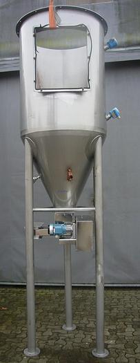 1.000 Liter, Best.-Nr.: T2294, Liter: 1.000, Material: Edelstahl AISI 304, Auf Lager: Ja, Menge auf Lager: 1 Stk., Artikel: Silo, Stehend: 3 Stk. Füße, Oben: Offen mit Verstärkungsring, Unten: Konisch, Innendurchmesser: 950 mm., Gesamthöhe: 3550 mm., Sonstiges: Schraubausgang im Boden