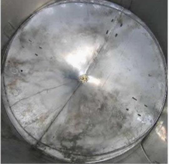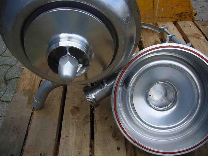 8.500 Liter, Best.-Nr.: T1799, Tank, Edelstahl, oben geschlossen, auf Füßen stehend., Oben und unten konisch., Tankdeckel oben., 1900 mm., Der Tank ist leicht verbeult., Liter: 8.500, Material: Edelstahl AISI 304