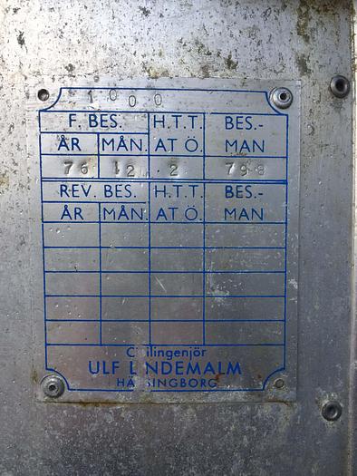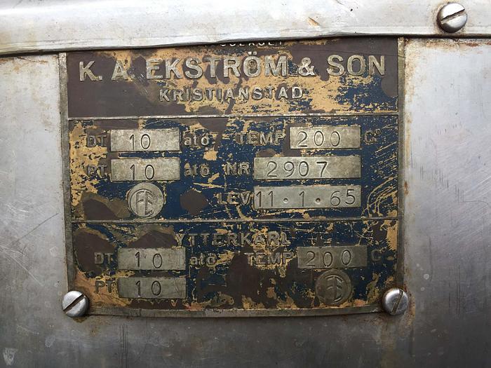 770 Liter, Best.-Nr.: T3542, Liter: 770, Material: Rostfreier säurebeständiger Stahl AISI 316, Auf Lager: Ja, Menge auf Lager: 1 Stk., Artikel: Tank, Stehend: Auf Beinkonsol, Oben: Unten: Verteilt, Doppelmantel: Ja, Heizschlange: Heiz-/Kühlschlange, Isoliert: Ja, Außenverkleidung: Genietete Verkleidung, Inspektionsdeckel: Oben, 200 mm., Rührwerk: Ja, Motor: 1,5 kW - 220/380 Volt - 240 U/min., Innendurchmesser: 786 mm., Außendurchmesser: T 926 mm., Maße: L 1350 x B 1350 x H 3250 mm., Hersteller: K.A. Ekström & Son, Baujahr: 1964