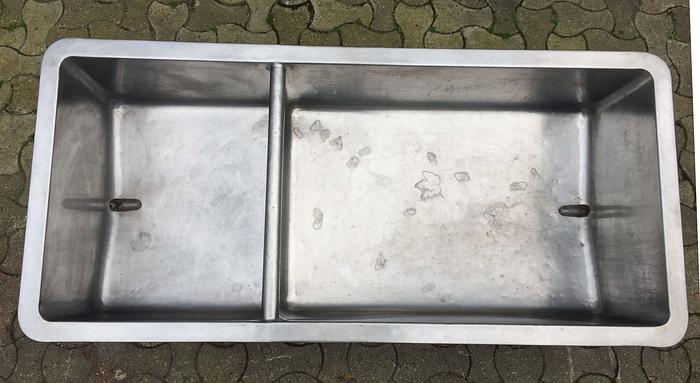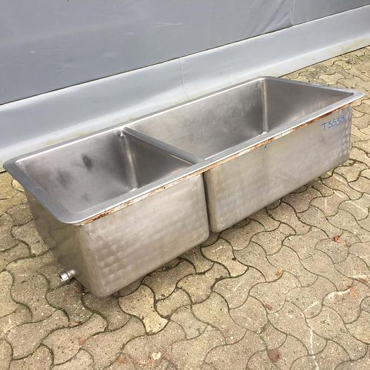 280 Liter, Best.-Nr.: T3538, Liter: 280, Material: Edelstahl AISI 304, Auf Lager: Ja, Menge auf Lager: 1 Stk., Artikel: Doppelwanne, Oben: Offen mit Verstärkungsring, Boden: Auslauf im Boden, Maße: L 1495 x B 690 x H 390 mm.