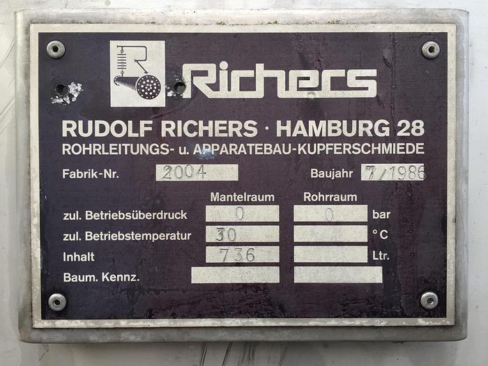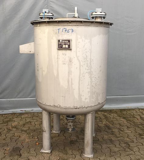 736 Liter, Best.-Nr.: T1767, Liter: 736, Material: Edelstahl AISI 304, Auf Lager: Ja, Menge auf Lager: 1 Stk., Artikel: Tank, Stehend: 4 Stk. Beine, Oben: Offen mit verschraubtem Deckel, Unten: Unten, Tankdeckel: Oben, 450 mm., Innendurchmesser: 980 mm., Gesamthöhe: 1700 mm., Hersteller: Richers, Baujahr: 1986