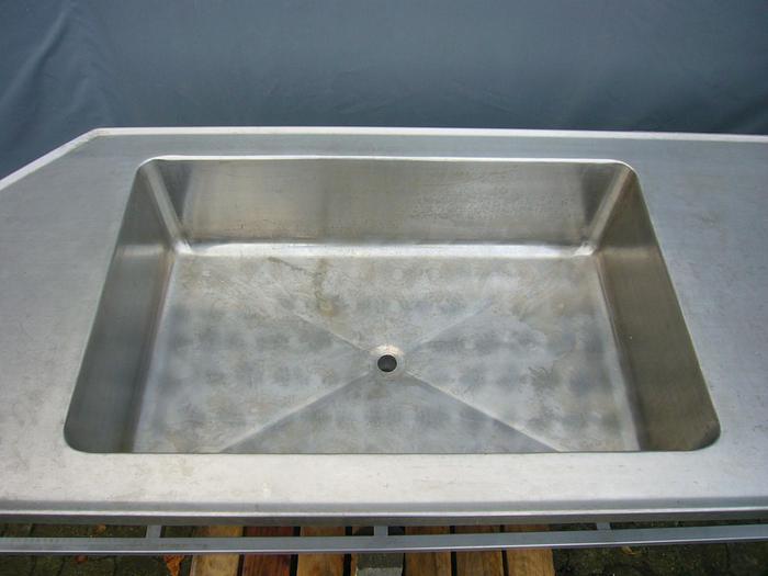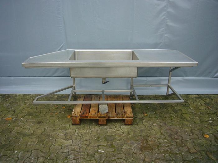 Best.-Nr.: D1052, Tisch, Edelstahl, mit Ständer für Wandmontage., Spüle L 880 x B 540 x H 240 mm.,, Tischplatte L 2150 x B 700 mm., Material: Edelstahl AISI 304, Größe: Tischplatte L 2150 x B 700 mm.