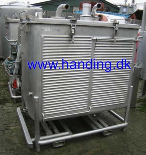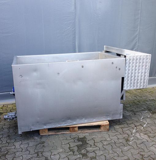 1.750 Liter, Best.-Nr.: T1573, Tank, Edelstahl aus säurebeständigem Stahl, oben offen, mit Klappdeckel, auf Füßen stehend mit LKW-Griff., Doppelmantel., Horizontales Rahmenrührwerk., L 1450 x B 1050 x H 1300 mm., Liter: 1.750, Material: Edelstahl AISI 316