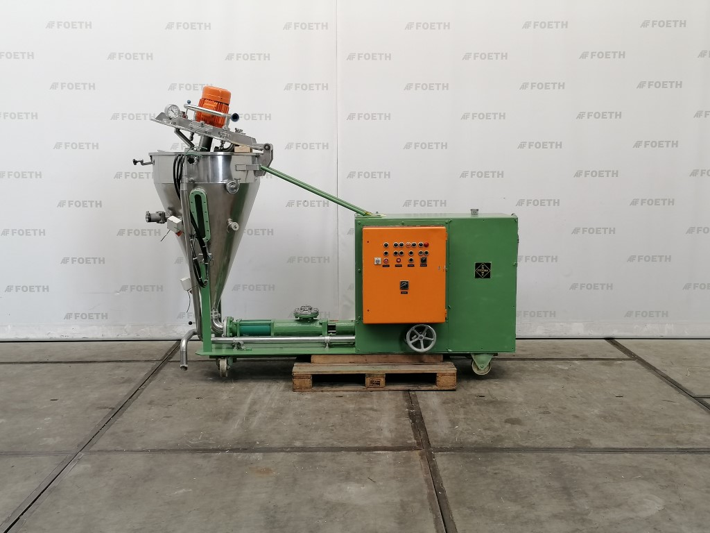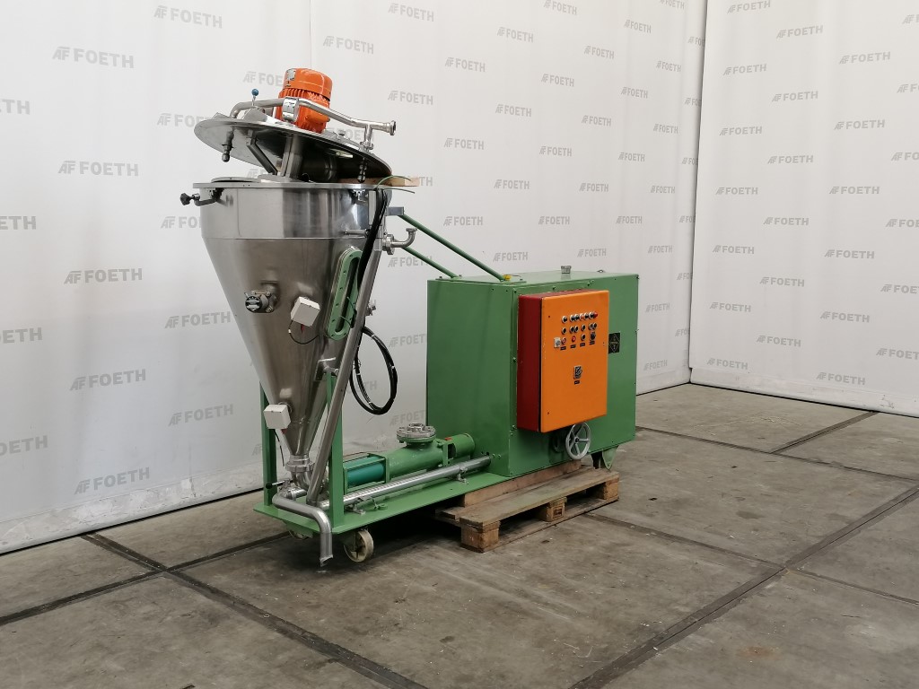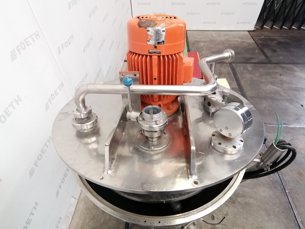 General SKU290S395 HerstellerFryma Rheinfelden TypVE / III NummerF 70.1286 Pressure Vakuum möglichcheck Haupteigenschaften MaterialEdelstahl Motor2.3 KW Einlass durchm.35 mm Spezifizierte Eigenschaften - Entlüfter Vakuum Entlüftercheck Kesselinhalt300 Ltr. Kesseldurchmesser800mm Zylindrische Höhe225mm Konische Höhe1100mm Mit Schleudertellerdia. 650mm, disc speed 1410 Rpm Motor2.3 kW, 380 Volt Mit Vakuumpumpecheck Motor3 kW, 380 Volt Mit ProduktpumpeNetzsch, type NE-50 Motor2.6 kW, 380 Volt Stufenlos regelbare Antriebcheck MaterialEdelstahl Information Baujahr1970 StandortBarneveld Fahrbarcheck Mit Schaltschrankcheck Platzbedarf3.1x1.3M Totalhöhe2.2M Gew ...