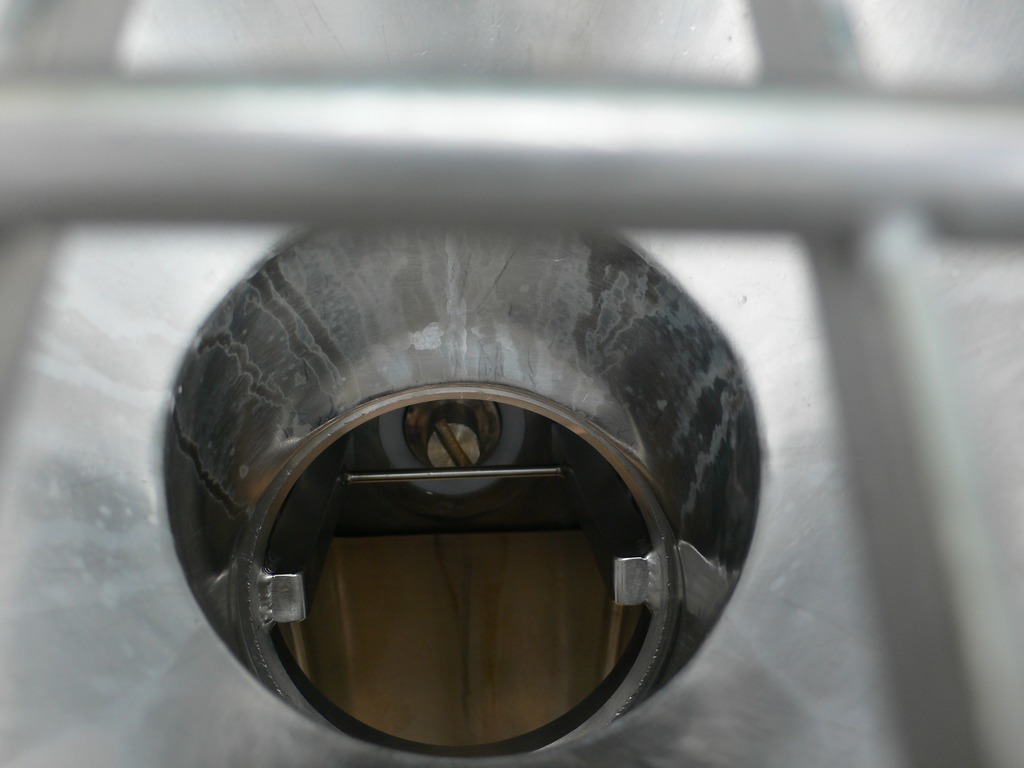 Lagernummer: F891, Material: Edelstahl AISI 304, Auf Lager: Ja, Lagermenge: 4 Stück, Artikel: Fülldüse, Verarbeitung: 21 mm. Auslass mit pneumatischer Clip, Einlass: 1 1/2, Sonstiges: Auf Winkelverstreben montiert