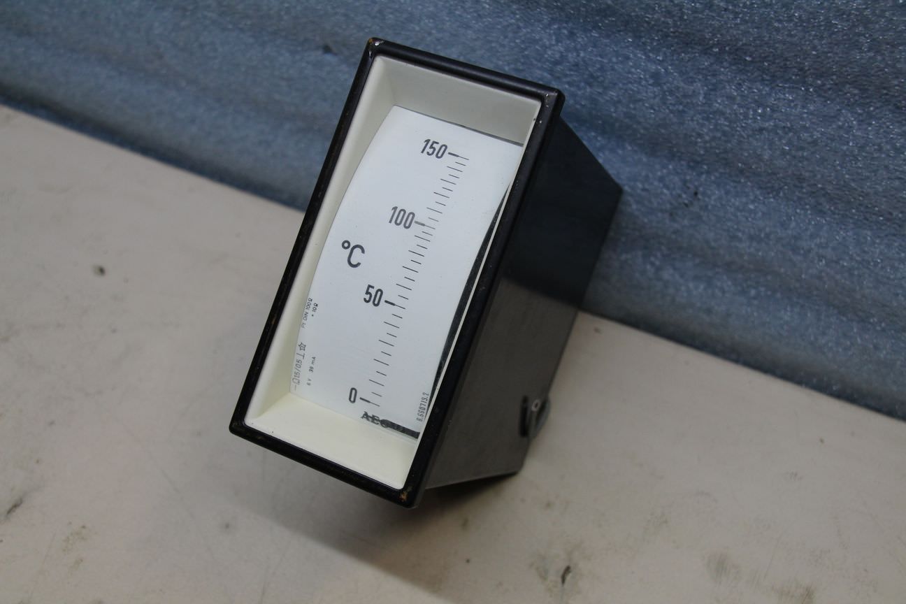 Gebrauchte AEG Temperatur Meßgerät 0-150°C. Einbaumessgerät, Einbau-Messinstrumente, Messwerk, Drehspulinstrumente, Drehspulmesswerk, Temperatur Messgerät, Schalttafel -Typ: Nr. 6.660713.2 -Anzeigebereich: 0 °C - 150 °C -Einbaumaß: LxBxT ca. 66x138x192 mm -6 V 39 mA -Abmessungen: 72/144/H192 mm -Gewicht: 1 kg