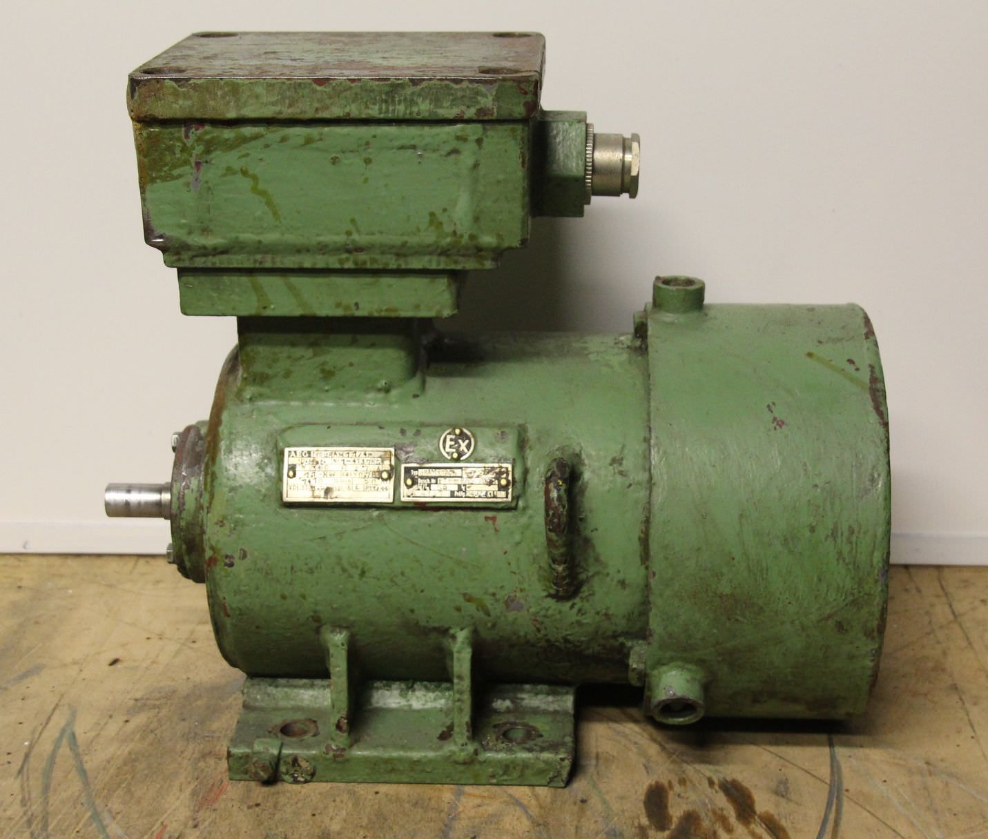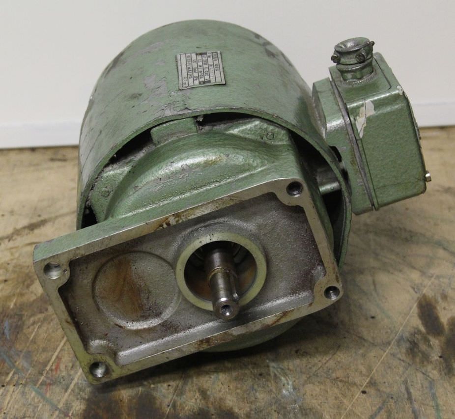 Gebrauchte AEG NKP33f-2. regelbarer Getriebemotor, Verstellgetriebemotor, Elektromotor -Hersteller Getriebe: AEG -Hersteller Motor: AEG -Motorleistung: 0,175 kW -Drehzahlbereich: 450-4000 U/min -Motor: regelbar -Bauform: B3 -höhe Wellenachse: 80 mm -Antriebswelle: Ø 14 mm -Anzahl: 1 Stück Motoren vorhanden -Preis: pro Stück -Abmessungen: 380/200/H240 mm -Gewicht: 22 kg