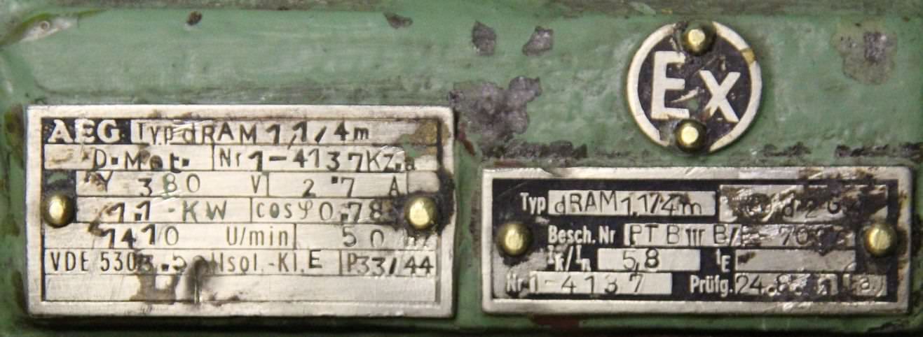 Gebrauchte AEG DRAM1,1/4m EX. Elektromotor, Drehstrommotor -Leistung: 1,1 kW -Drehzahl: 1410 U/min -Welle: Ø 18 mm -Bauform: B3 -Schutzart: EX -Abmessungen: 390/210/H340 mm -Gewicht: 49 kg