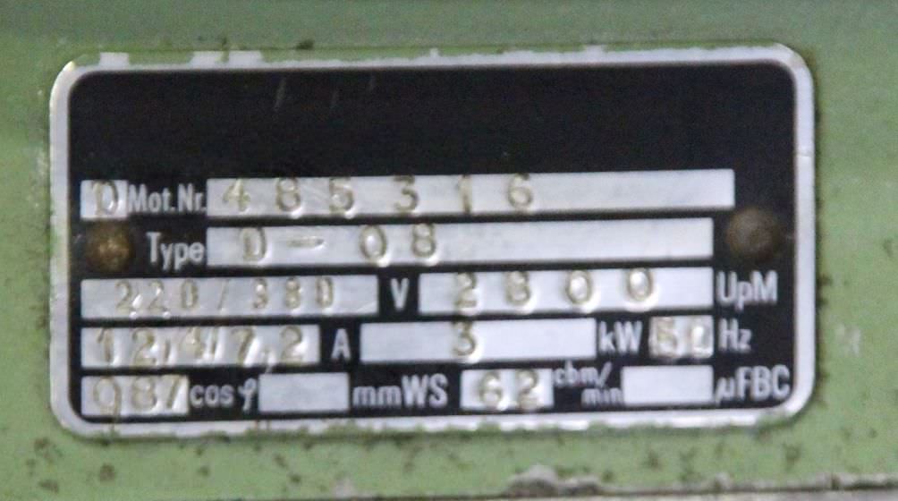 Gebrauchte AEG 48 m³/min. Hochdruck-Radialventilator, Staubabsauggebläse, Abgas Absaugung, Schweissrauchabsugung, Absaugung, Ventilator, Druckgebläse, Vakuumgebläse -Motorleistung: 2,2 kW -Drehzahl: 2820 U/min -Volumenleistung: 48 m³/min -Druckerhöhung: kPA -Anschluss Eingang: 180 mm -Anschluss Ausgang: 155 x 155 mm -Anzahl: 1x Gebläse vorhanden -Abmessungen: 440/380/H420 mm -Gewicht: 31 kg