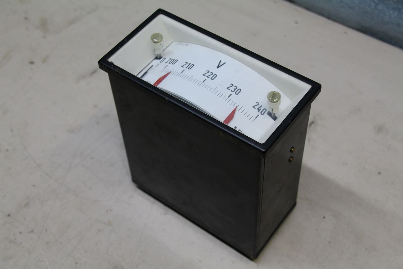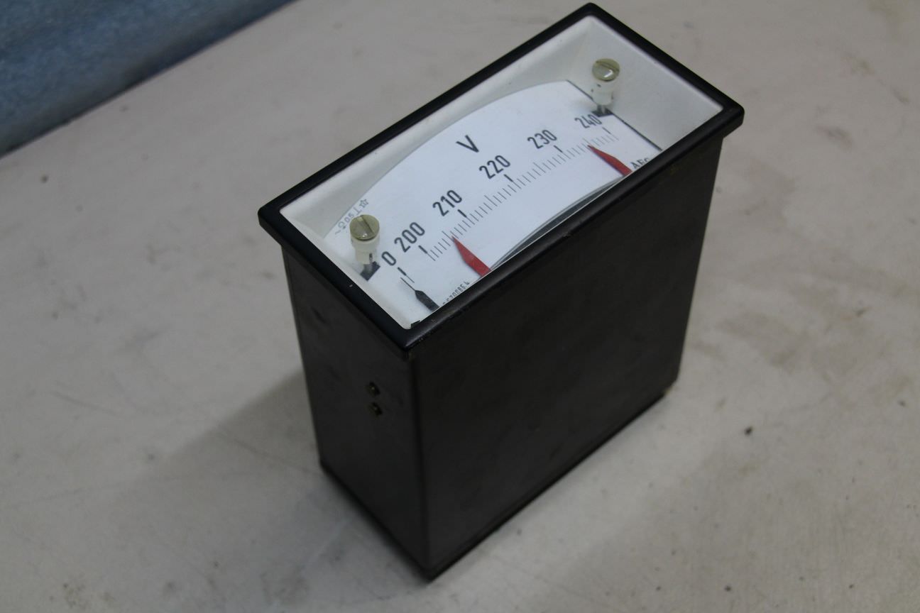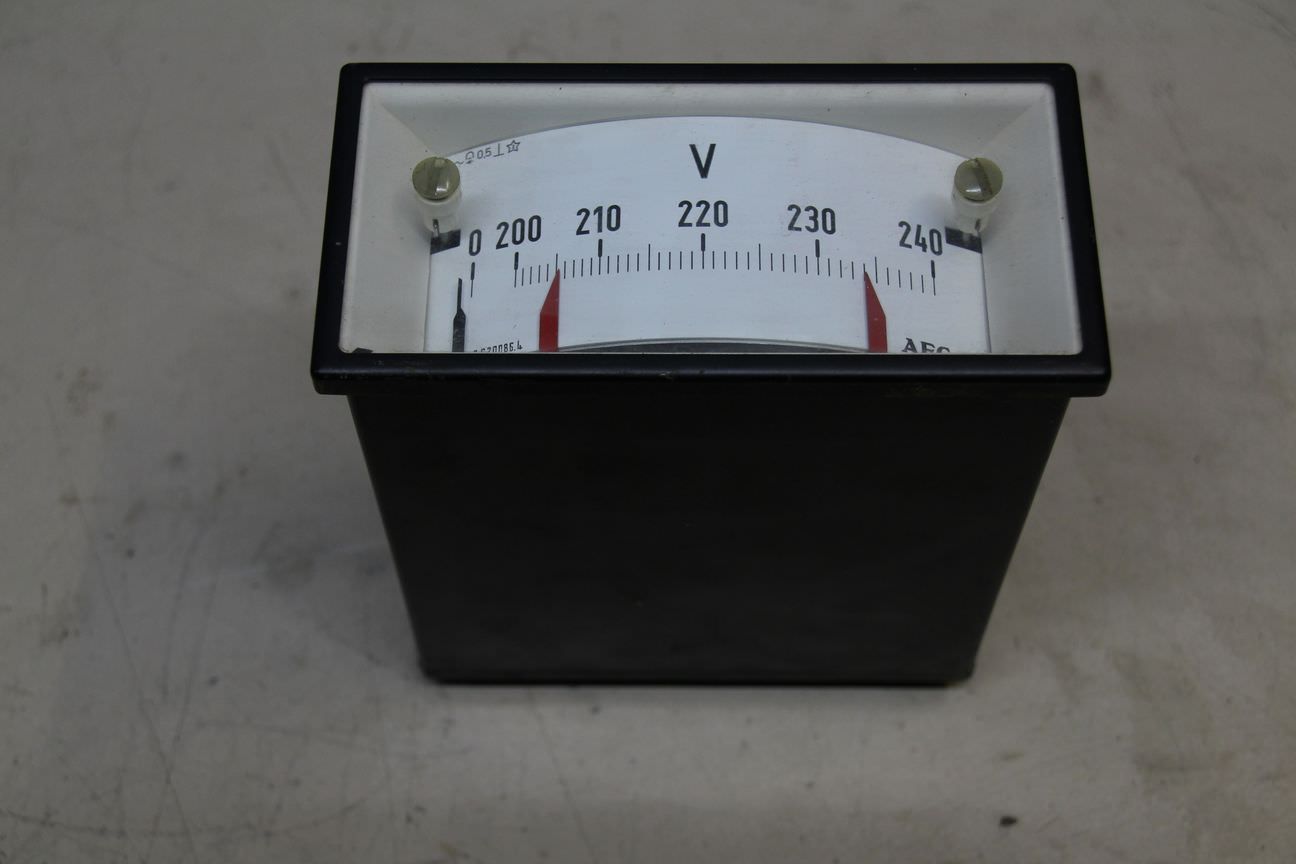 Gebrauchte AEG Spannungsmessgerät, Voltmeter 200-240V. Einbaumessgerät, Einbau-Messinstrumente, Messwerk, Drehspulinstrumente, Drehspulmesswerk, Schalttafel -Typ: Nr. 6.620086.4 -Anzeigebereich: 200 V - 240 V -Einbaumaß: LxBxT ca. 66x138x165 mm -Anzahl: 3x vorhanden -Preis: pro Stück -Abmessungen: 72/144/H165 mm -Gewicht: 1 kg