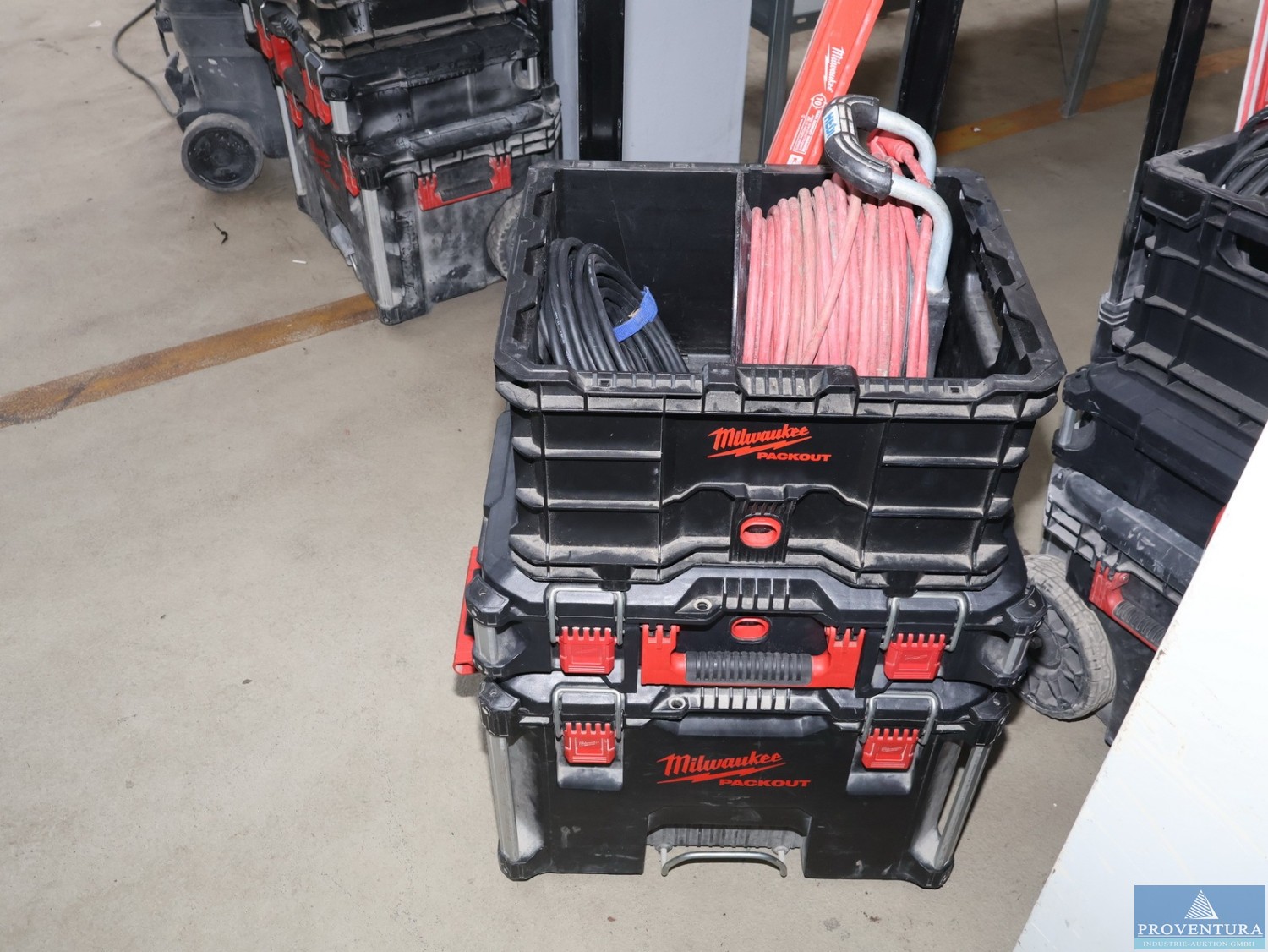 Akku-Werkzeug-Satz Heizung/Sanitär (HSL) bestehend aus Kabeltrommel, Kabel 230 V, Wasserwaage MILWAUKEE, 120 cm, Elektriker-Werkzeug, Leuchte MILWAUKEE M18PAL, Akkuschrauber M18HD2, Winkelschleifer M18ONEFSAG125XPDB, Schlagschrauber M18ONEIWF, Säbelsäge M18FHZ, Akku-Bohrhammer M18CHX, Ladegerät, 4 Akkus, 2 Systainer, 1 Box, Packout-Trolley M12-18FC, ca. 14 Sätze