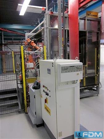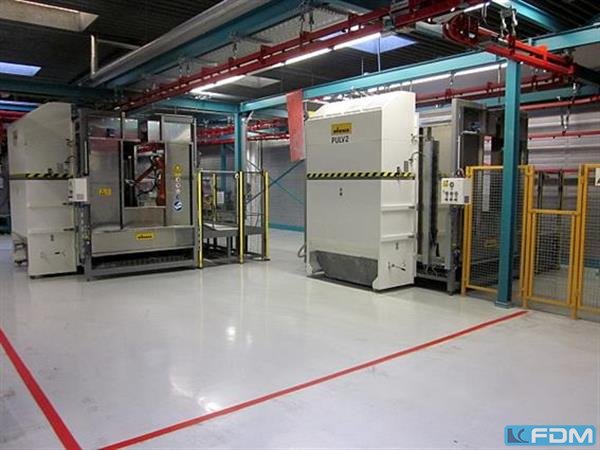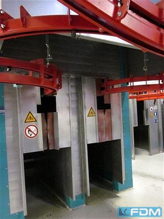 Kabinenbreite: 750 Kabinenhöhe: 1000 Raumbedarf ca.: 1200 m2 Nachfolgend die wichtigsten Informationen zur Pulverbeschichtunganlage Eisenmann: Komplette Anlagentechnik: Power&Free Foerdersystem mit 250 Wagenzuegen 5-Zonen Spritzvorbehandlungsanlage, Edelstahl Haftwassertrockner Kuehlzonen 2 Wagner Edelstahl Pulverkabinen je mit ABB- Roboter und je Doppel-Automatik-Pulverpistolen zusaetzlich je Kabine ein Hand-Pulvergeraet Pulvereinbrennofen, direkt gasbeheizt 3-Zonen Spritzreinigungsanlage, Edelstahl Abwasseraufbereitungsanlage mit Verdampfer Umkehrosmoseanlage Hallenzuluftanlage alle zugehoerigen elektr. Schalt- u. Steueranlagen Stellflaeche: ca. 1.200 m2 Oeffnungsquerschnitte: Breite 750 mm, Hoehe 1.000 mm Auslegungsdaten: Foerdergeschwindigkeit Vorbehandlung 2,3 m/min Vorbehandlungsoberflaeche ca. 200 m2/h Lackieroberflaeche ca. 120 m2/h Durchsatz an Werkstuecken mit Gehaenge ca. 4.0 ...