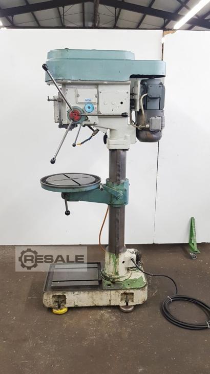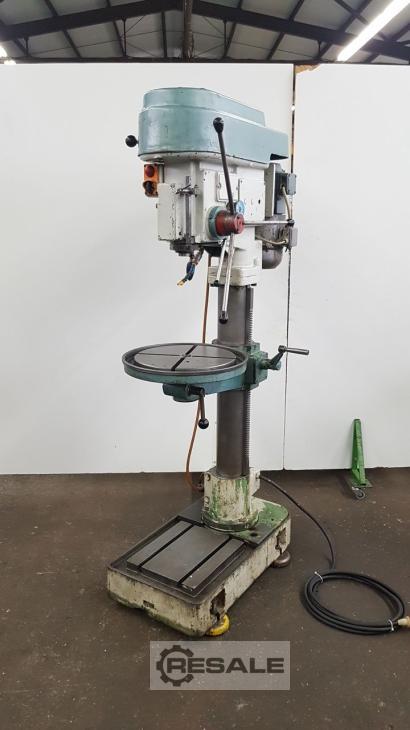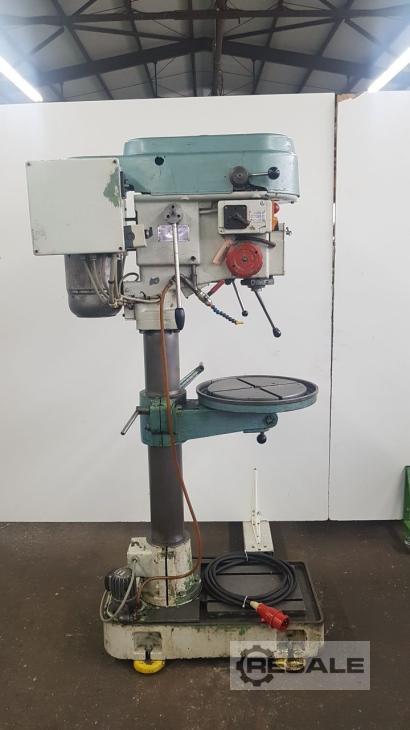 Gebrauchte ALZMETALL AB3/ESV. Technische Daten: - Bohrleistung in Stahl ST 60 28 mm - Bohrvermögen in Stahl ST 60 32 mm - Bohrspindelaufnahme MK 3-Langspindel - Bohrspindelhub 180 mm - Bohrspindeldrehzahlen stufenlos ca. 140 - 1600 U/min - 3 Vorschübe 0,1 ; 0,2 ; 0,3 mm/U - Ausladung 290 mm - max Abstand Tisch - Bohrspindel 620 mm - Rundtisch mit 2 T-Nuten 450 mm - Höhenverstellbar über Zahnstange mit Handkurbel - Kühlmitteleinrichtung - Antrieb 380 V / 0,9 / 1,3 kW - Platzbedarf ca. B 750 x H 1900 x T 700 mm - Gewicht ca. 280 kg