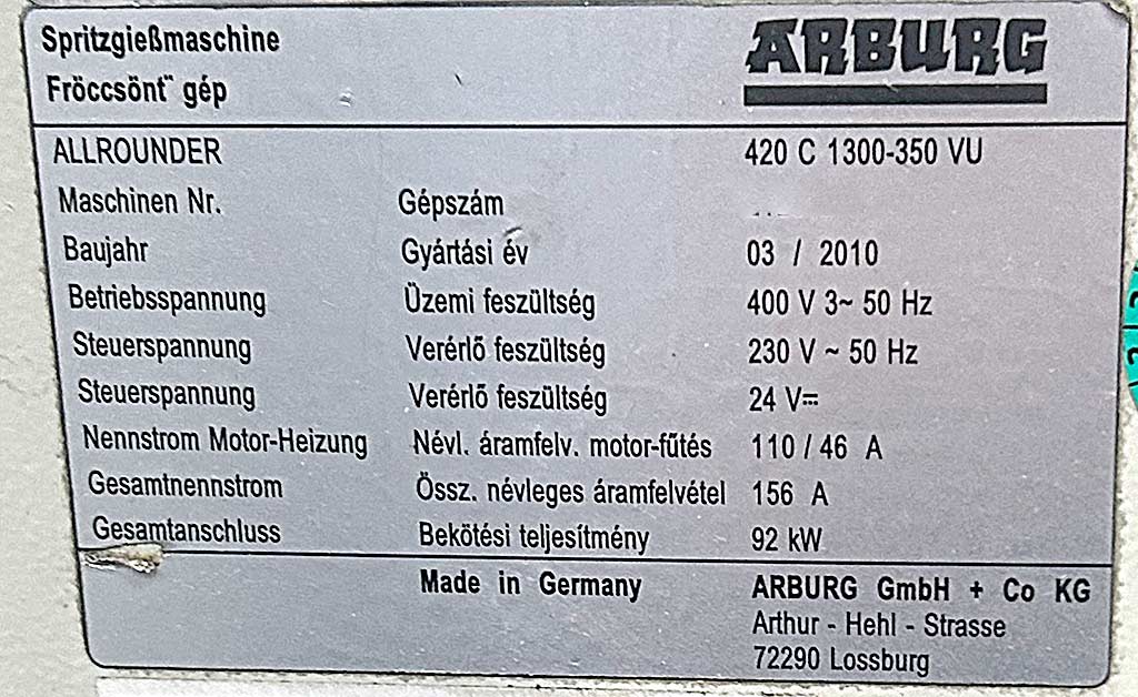 | 2010 | ARBURG | Allrounder 420C 800-100 VU | |