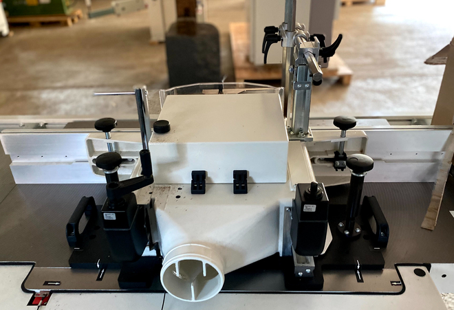 Ausführung mit seitlichem Zapfenschneidschiebetisch mit schrägstellbarem Teleskoplineal mit vier Anschlägen und Referenzvorrichtung, Splitterholz am Anschlag, Not/Ausschalter, Schutzarm für Bediener, Mikroschutzschalter mit Drehzahlbegrenzung 3000/4500 min¯¹, Zapfenschneidhaube