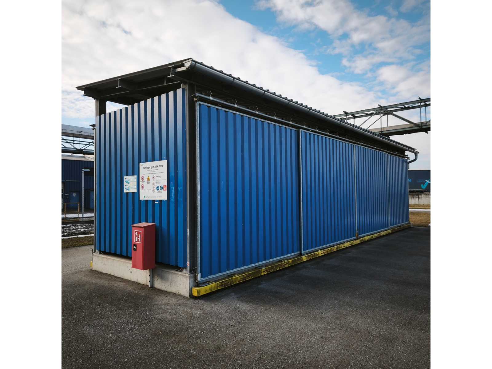 Material-/Lagerbehälter mit seitlichen Rolltüren auf beiden Seiten, verzinktes Stahlunterbauwerk mit blauen trapezförmigen Paneelen, montiert auf einem Betonsockel. Abmessungen LxWxH in cm 1200x345x350 Auktions-ID: A1-45187-397