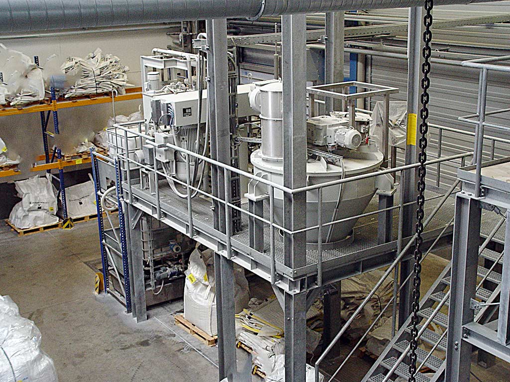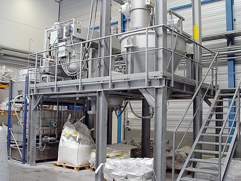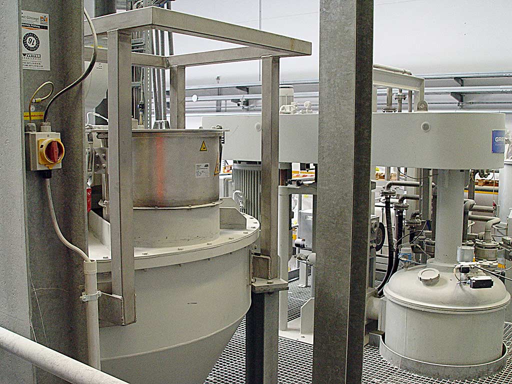 Ein komplette Vakuumdissolver-Anlage Grieser zur Herstellung homogener Pastenmischungen steht zur Verfügung. 1) Hochleistungs-Vakuum-Dissolver Grieser GFVD 750 FU, Baujahr: 2009, Antriebsleistung: 75kW, Mischwellen-Drehzahl: 1500U/min, Gesamtvolumen: 550l, Mischvolumen: 400l, Mischwerkzeug-Durchmesser: 450mm, Vakuumleistung: 160m³/h, Gewicht: ca. 2800kg. 2) Fluidisierungsbehälter Grieser FB 2000, Baujahr: 2009, Gesamtvolumen: 2000l, Nutzvolumen: 1300l, Entleerleistung: 10l/min, Auslaufgeschwindigkeit: 0,9m/s, Gewicht: ca. 2000kg. 3) Big Bag Entleerstation. 4) Pumpensystem für Flüssigkomponenten, Typ: IBC, IBC-Anzahl: 4, Volumen: 1000l. 5) Radialventilator V30/2, Volumenstrom: 410m³/h. Dokumentation vorhanden. Eine Besichtigung vor Ort ist möglich.