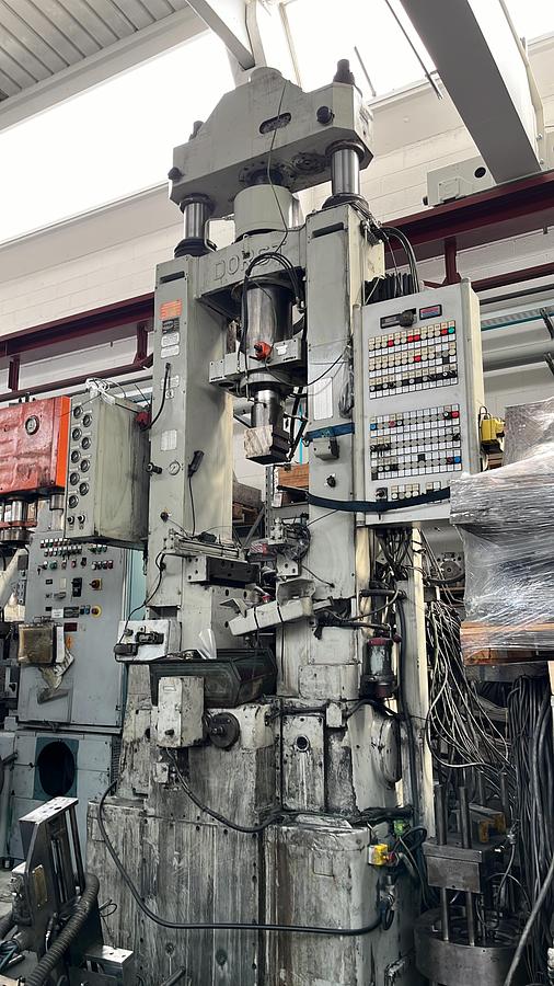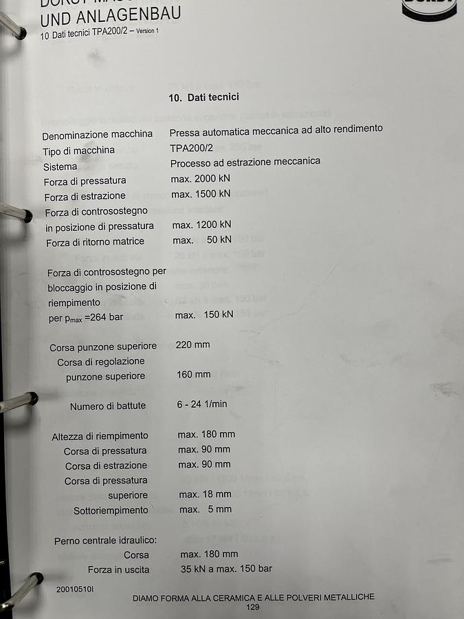 Presskraft max.: 1000 Kn, Abzugskraft max.: 800 Kn, Pressstellung max(Ruckholkraft del Matrize).: 600 Kn, Fullstellungsverriegenlung max.: 40 Kn, Oberstempelhub: 220 mm, Oberstempel-Verstellweg: 200 mm, Hubsahl: 5-18 1/min, Füllhöhe max.: 180 mm, Pressweg max.: 85 mm, Abzugweg max.: 95 mm, Oberer Pressweg max: 18 mm, Oberstempel pneumatische Vorspannung max.: 80 mm, Druckluftversorgung, Luftverbrauch, Ansaugluft ca.: 140 1/min, Gesamtanschlusswert ca.: 23,0 Kw, Breite ca.: 1950 mm, Tiefe ca.: 1550 mm, Höhe ca.: 3900 mm, Gewicht der Presse ca.: 9.900 Kg, Pressgehäuse: 180 l (Getriebeöl), Arbeitsplatzbezogener Lärm: 78 dB(A)