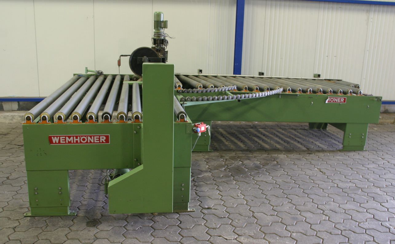 Dreheinrichtung Kantenbearbeitung, Wendestation, Wendetisch, Drehstation, Drehtisch, Transportsystem, Rollenbahn -für Kantenaleimautomat, Kantenanleimmaschine, Kantenanleimer -Wendestation: zur Drehung von Werkstücken -Rollenbahn: Schmal -Rollenbreite: 1300 mm -Rollenbahn Länge: 2900 mm -mit: verstellbarer Prallwand -Rollenbahn: Breit -Rollenbreite: 3400 mm -Rollenbahn Länge: 1400 mm -Drehkopf Rolle: gummiert -Transport Abmessungen: 3000/1500/H960 mm 3500/1550/H1850 mm -Gewicht: 1000 kg