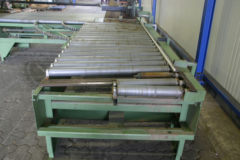 Angetriebene schwere Rollenbahn für eine Gattersäge, Bandsäge Maschinen Abmessungen: Gesamt Länge 8300 mm, Breite 1800 mm, Walze Breite 1600 mm Höhe walze von Boden 580 mm, Walze Anzahl 11 Stück Getriebemotor Leistung 2 kW/1400 u/min Gesamt Gewicht 2000 kg. Neuewertiger Zustang