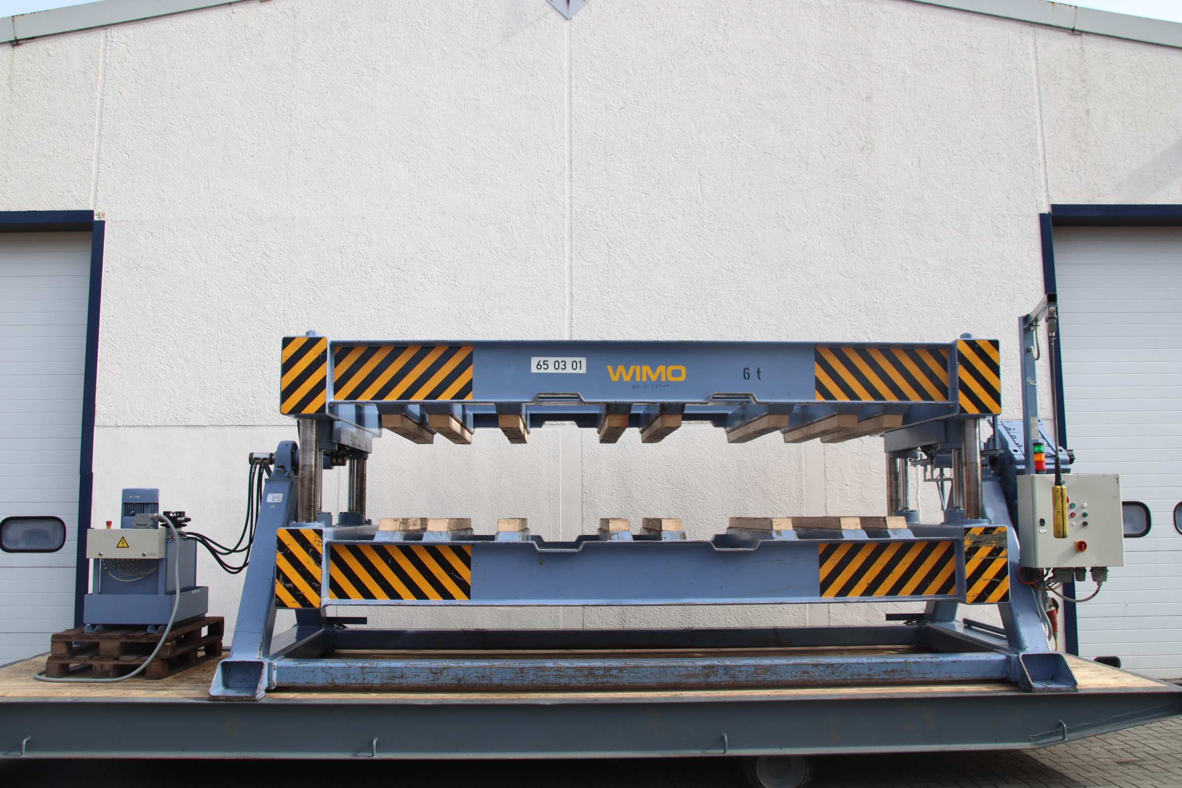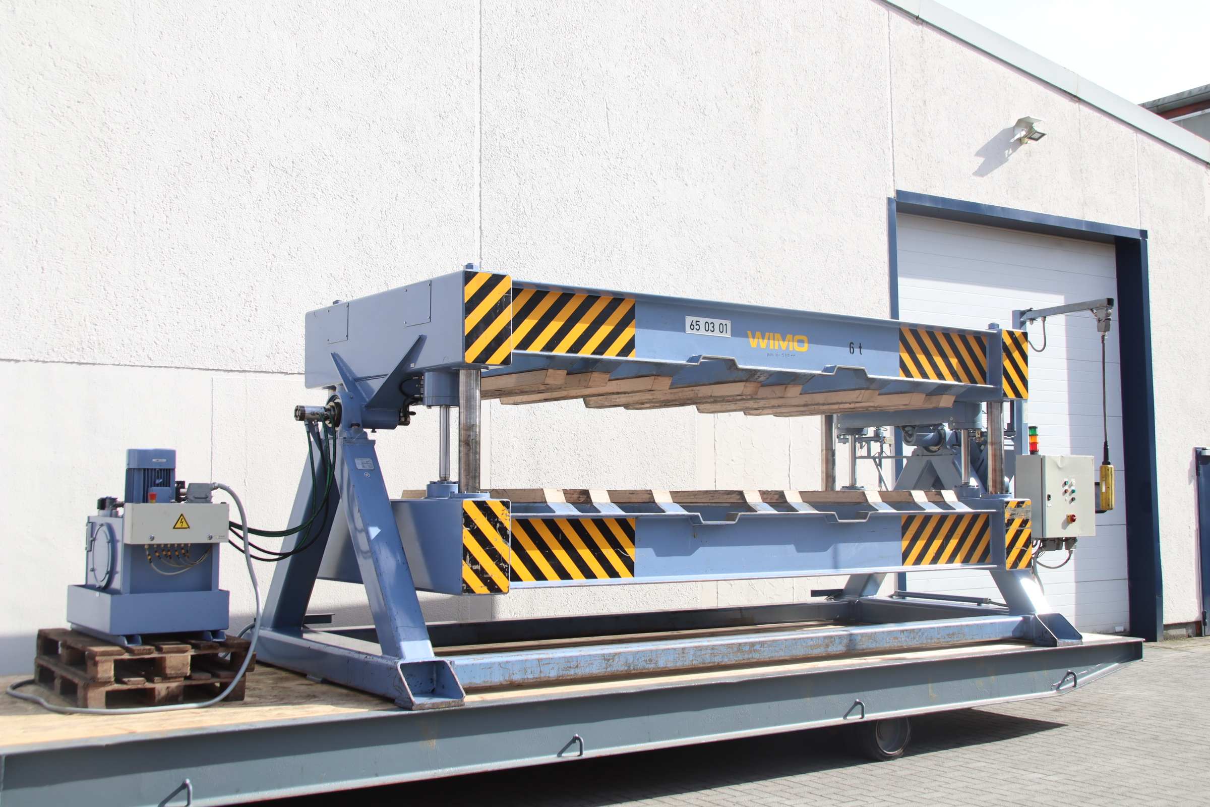 Wendeeinrichtung, Wendestation, Wendetisch, Drehstation, Drehtisch, Hydraulikpresse, Werkstattpresse, Ölhydraulische Presse, Werkstatt Hydraulikpresse -Hersteller: WIMO Hebetechnik -Wendeeinrichtung: gleichzeitiges Wenden mehrer Platinenstapel, oder Drehung von Werkstücken -Beladung: be- und entladen von vorn mit Gabelstaper -Innen Breite max.: 4000 x 1700 mm -Innen Höhe max.: 580 mm -Innen Höhe min.: 250 mm -Tragkraft: 6000 kg -Transport Abmessungen: 5960/2400/H2435 mm -Gewicht: 9000 kg