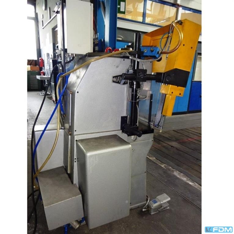 Einständer Kniehebelpresse MAY - MAYPRES - KOMATSU Typ MKN 1-63/6 Exzenterkniehebelpresse, Exzenterpresse Baujahr ca. 1984 Druckkraft 60 ton. Ausladung 160 mm Tischgröße 580 x 360 mm Stößelfläche Ø 270 mm Einspannzapfenbohrung Ø 40 mm Abstand zwischen den Ständern 218 mm Stößelhub 60 mm Auswerferhub 15 mm Stößelverstellweg 30 mm Einbauhöhe max. 300 mm (mit Tischzwischenplatte) Hubzahl 70 Hübe pro Minute Motordrehzahl 1400 U/min. Motorleistung 3 kW Netzanschluß 380 Volt, 50 Hz - pneumatische Kupplung und mechanischer Bremse mit pnematischer Entlastung (getrennte Kupplungs-Bremskombination) - Tischzwischenplatte L x B x H 580 x 360 x 58 mm, mit Bohrungen und Ausschnitten - mechanischer Auswerfer, Auswerfereinrichtung im Maschinentisch, Ø 80 mm - elektrische 2-Handbedienung und Fußschalter - beweglicher Schutzschirm, Schutzumhausung UNIDOR mit pneumatischem F ...