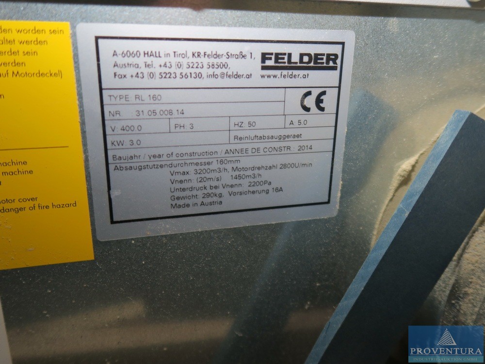 Späneabsaugung FELDER RL 160 Bj. 2014, 3.0 kW 400 V, max. 3.200 m³/h, Eigengewicht ca. 290 kg, S/N 310500814