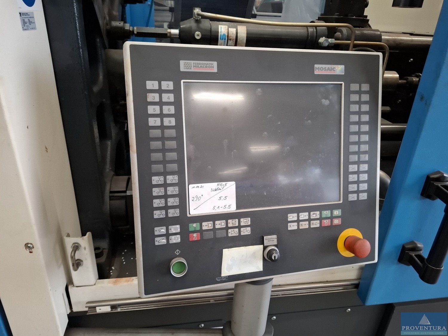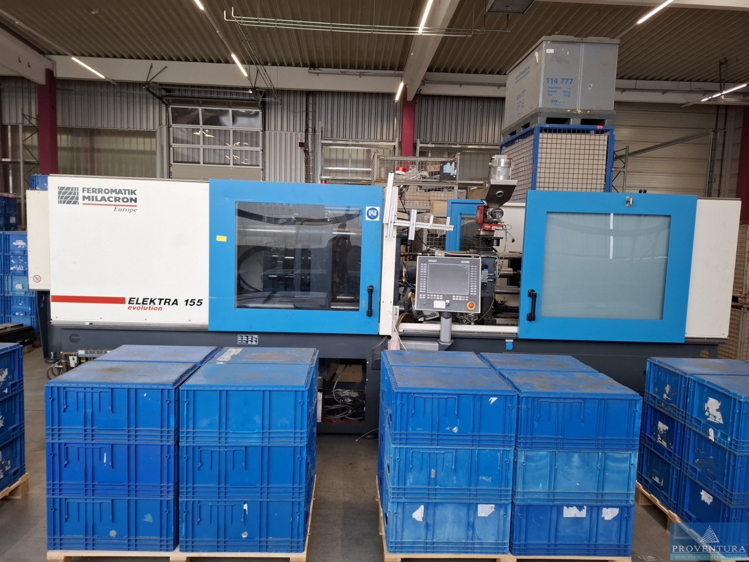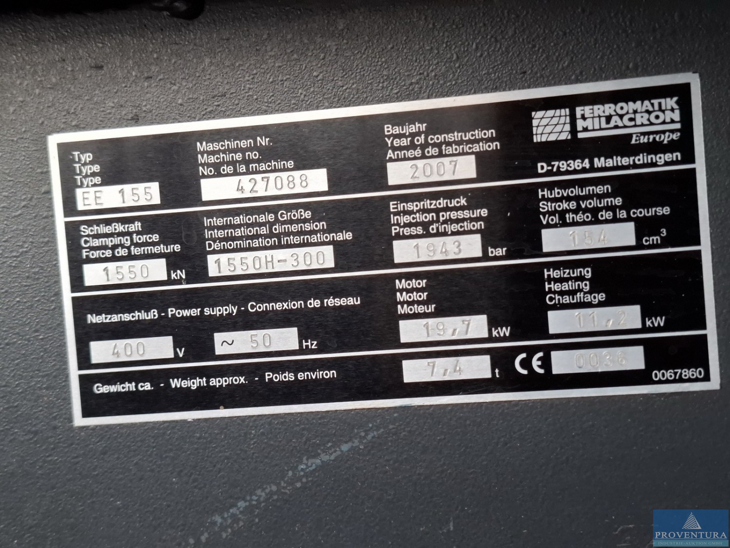 Spritzgiessmaschine FERROMATIK MILACRON EUROPE EE155 Bj. 2007 83.562 Bh (19.03.25, 25.03.26), Masch.-Nr. 427088, Schließkraft 1.550 kN, internationale Größe 1550H-300, Einspritzdruck 1.943 bar, Hubvolumen 154 cm³, 400 V/50 Hz, Motor 19,7 kW, Heizung 11,2 kW, Gewicht 7,4 t, CNC-Steuerung Mosaic, intern FERRO2, nach Kauf noch nicht angeschlossen