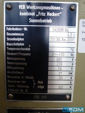 Senkrecht -Querschieberfräsmaschine, gebraucht    Vertical –milling machine, used Fabrikat/make:                                      WMW HECKERT Typ/ model: FQS 400 Baujahr/ Year: 1978 Steuerungsart / control:  konventionell   x-Weg:                      1190 mm   y-Weg:                                         530 mm z-Weg:                                    540 mm Tischgröße/ table:                       1600 x 400 mm Spindelleistung/ spindle power: 11kW Werkzeugaufnahme/ tool taper:   ISO 50 Drehzahlen/ speeds:                28 - 1400 U/min Vorschübe/ feeds:                16- 800 mm/min Gesamtleist ...