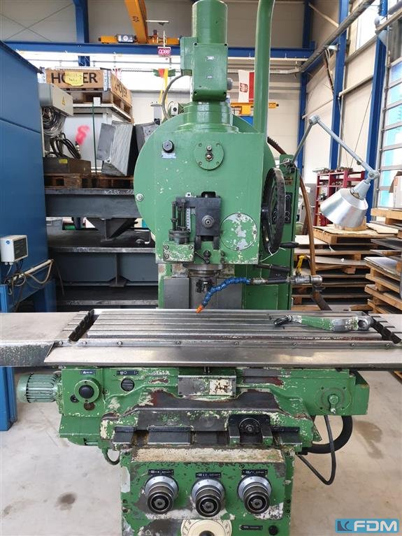 Fräsmaschine für Horizontal- und Vertikaleinsatz, Drehzahlbereich 22,4-1.000 U/min in 12 Getriebestufen Eilgänge für längs, Qer, und senkrecht, Antriebsleistung 5,5 KW Abmaße 2000 x 2650 x 1775 Gewicht 2500 kg Zubehör: Diverse Werkzeuge nach Absprache, inklusive grüner Beistellschrank