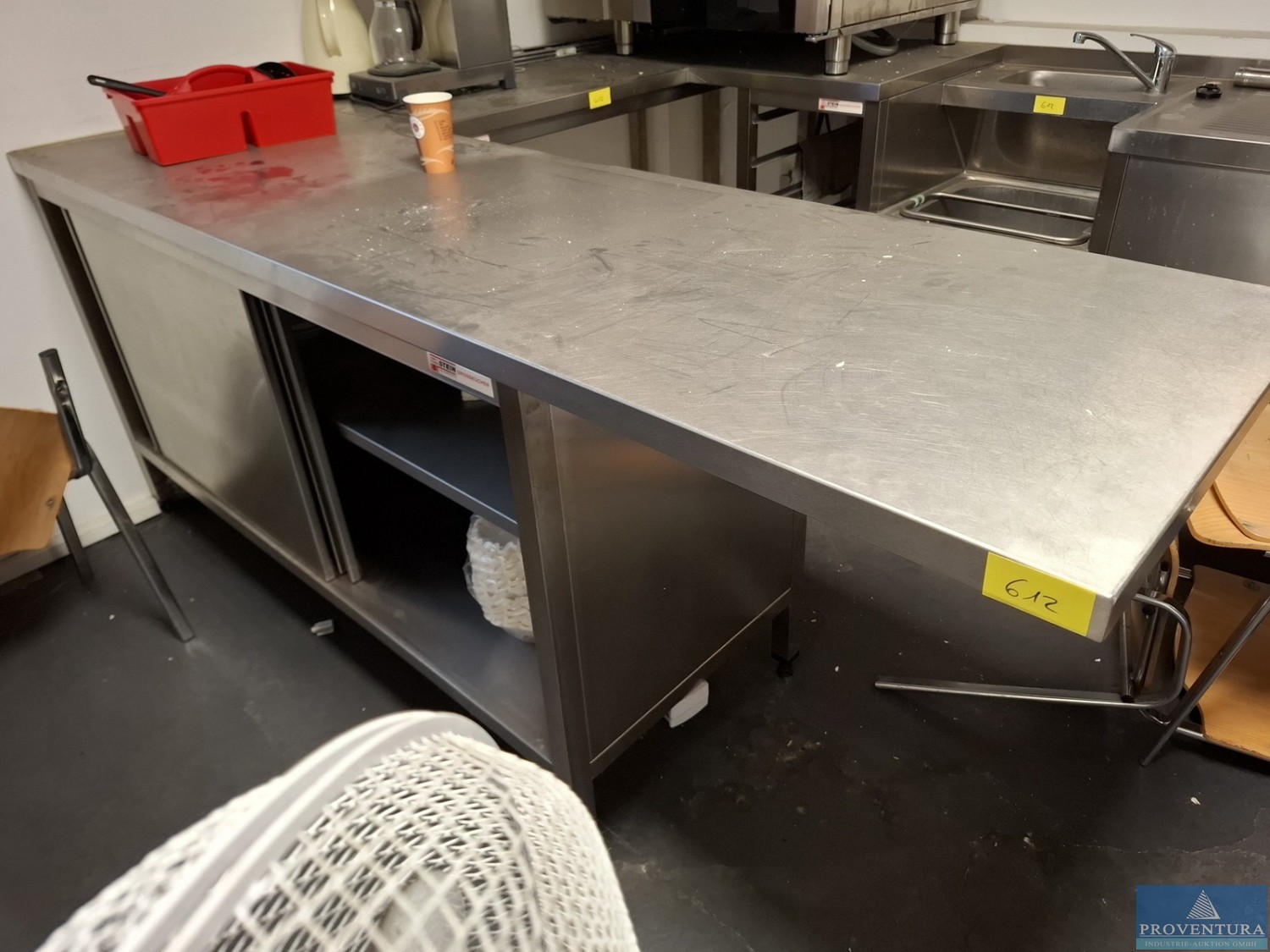 Gastromöbel STEIN Großküchen Edelstahl Schiebetürenschrank ca. 160 cm m. Arbeitsplatte ca. 200 cm, darunter Gestell für Einschübe GN 1/1 tief, Topfspülbecken, Doppelspültisch ca. 160 cm, Zwischengestell, U-Form, Kaffeemaschine BRAVILOR Bonamat Mondo 2