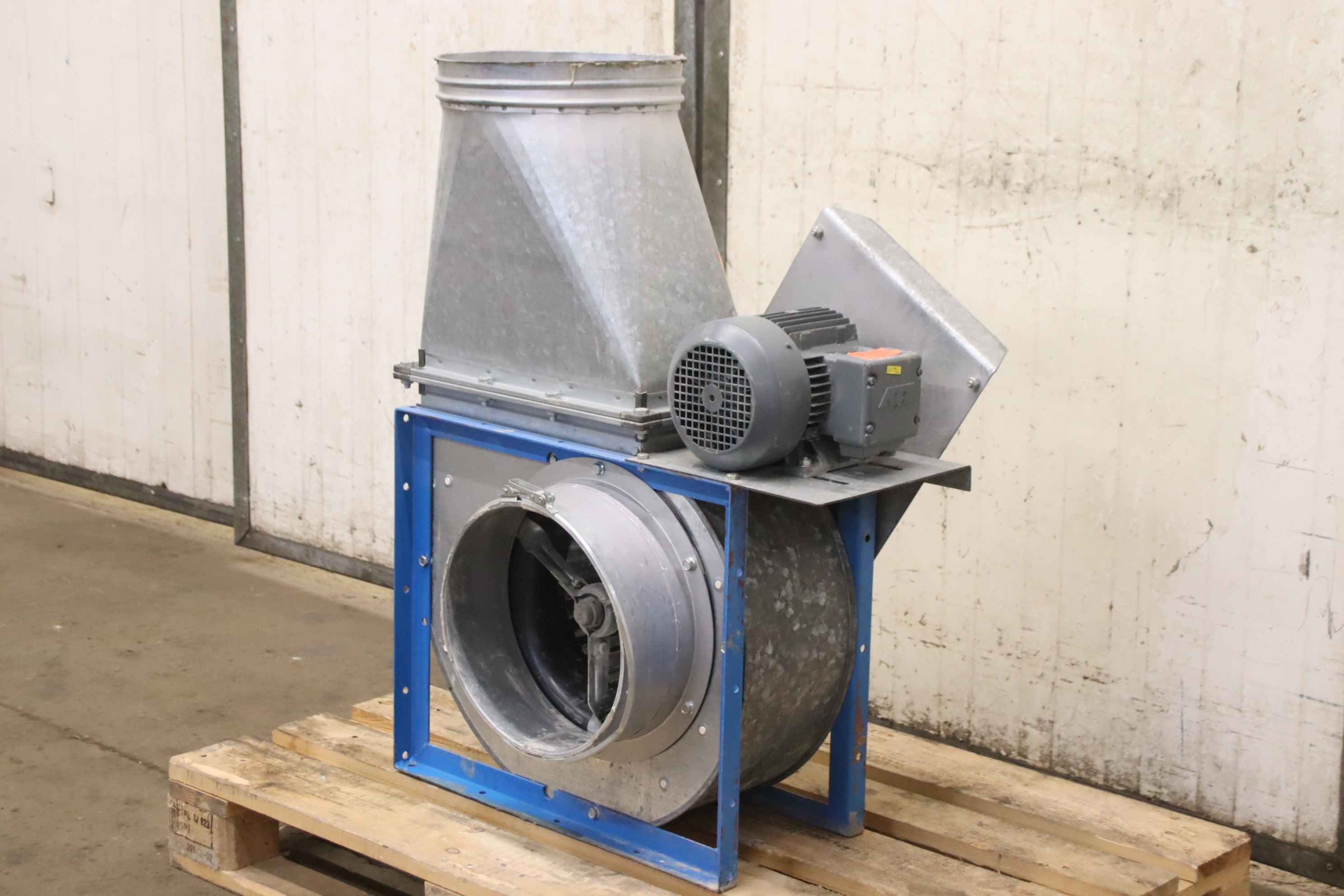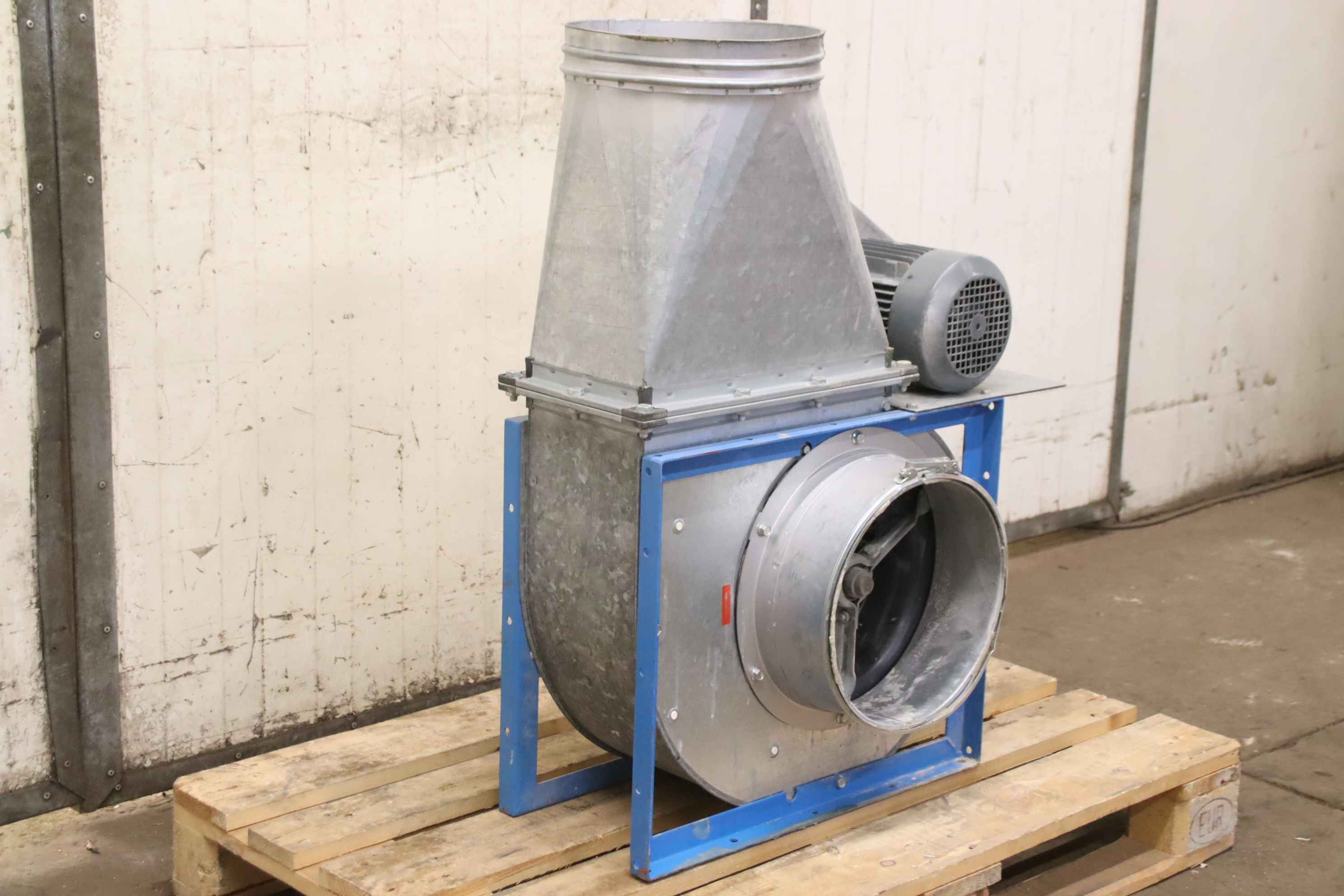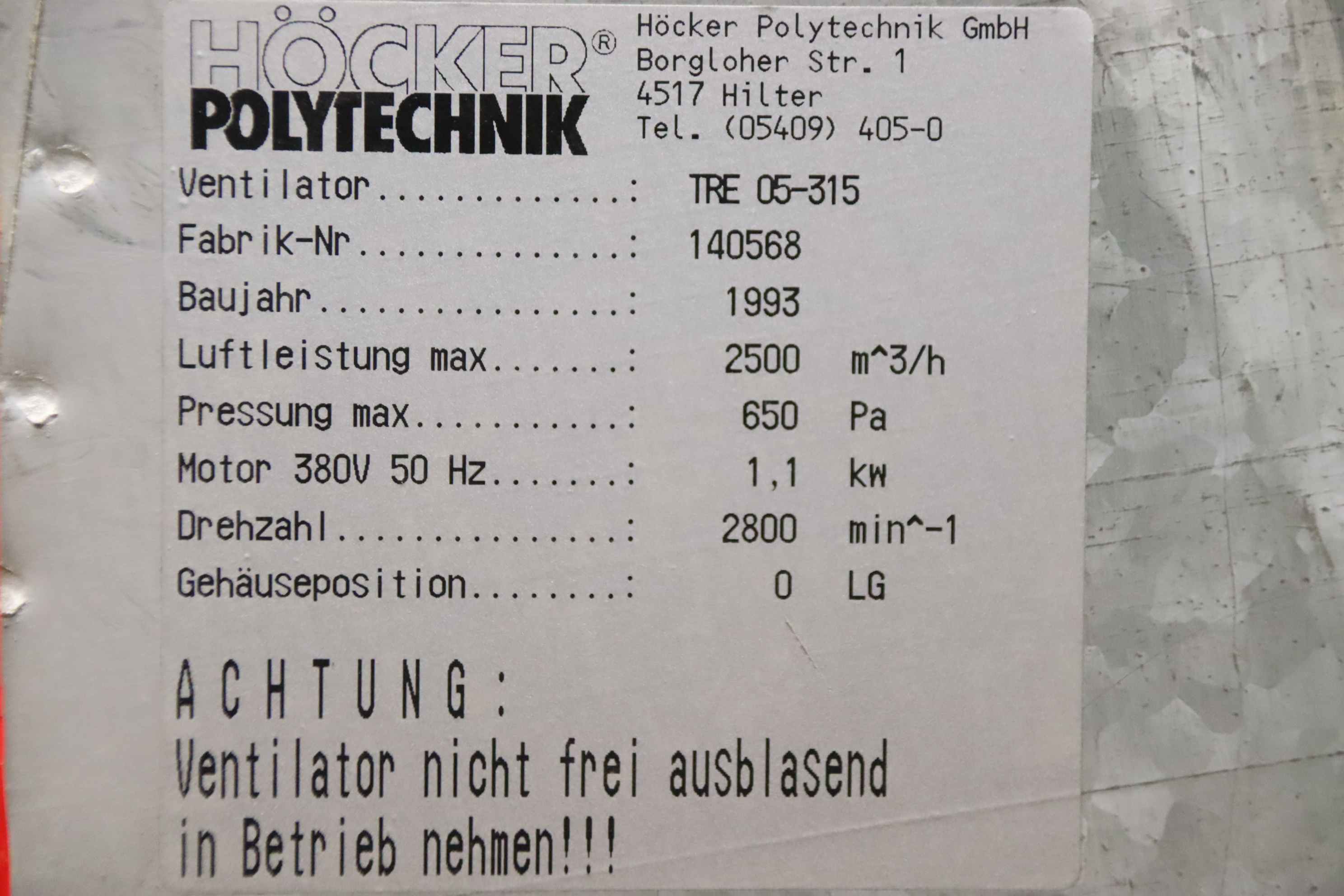 Hersteller: Höcker, Typ: K 35/250 Späneventilator, Baujahr: 03/2004, Motorleistung kW: 18,5, Luftleistung ca. m³/h: 5700, Drehzahl Umin: 1500, Keilriemenantrieb Motor: ja, Keilriemenscheibe Flügelrad: ja, Saugseite mm: 250, Ausblasseite mm: 350, Gewicht ca. kg: 420, Baujahr :03/2004
